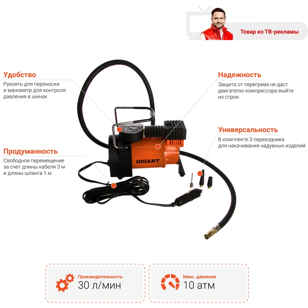 Автомобильный компрессор Gigant GAC-30 подойдет для длительных автомобильных поездок и позволит быстро наполнить воздухом спущенное колесо. Двигатель оснащен поршнем, что делает компрессор легким, но мощным. Модель оснащается встроенной защитой от перегрева, что значительно продлевает срок ее службы. Установка проста в применении и не требует специальных пользовательских навыков. Оборудование имеет безмасляное исполнение, поэтому не нуждается в техническом обслуживании. Производительность автокомпрессора составляет 30 литров в минуту, что означает, что он легко и быстро накачает шины с посадочным диаметром 13 — 14 дюймов на любом легковом автомобиле. Для внедорожников и грузовиков рекомендуется компрессор Gigant GAC-60 с производительностью 60 литров в минуту. Gigant – собственная торговая марка компании ВсеИнструменты.ру, разработанная специально для требовательных мастеров. Продукция представлена профессиональными и бытовыми инструментами, имеет доступную цену и высокое качество. При изготовлении товаров Gigant используется современное оборудование и прочные материалы. Производство осуществляется на современных предприятиях России и Азии. Тестирование товаров осуществляется в два этапа, каждая партия инструментов проходит проверку на соответствие стандартам и заявленным техническим характеристикам. Это является залогом качества и надежности готового продукта. Продукция представлена широкой линейкой инструментов. У нас можно приобрести ручной инструмент, строительный, садовый, сантехнический, климатический, крепежный, автогаражный, а также станки, расходные материалы и многое другое.