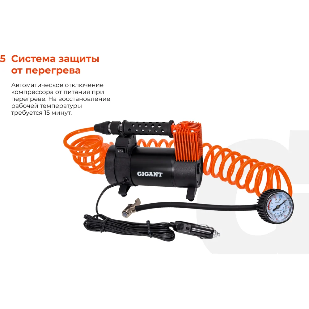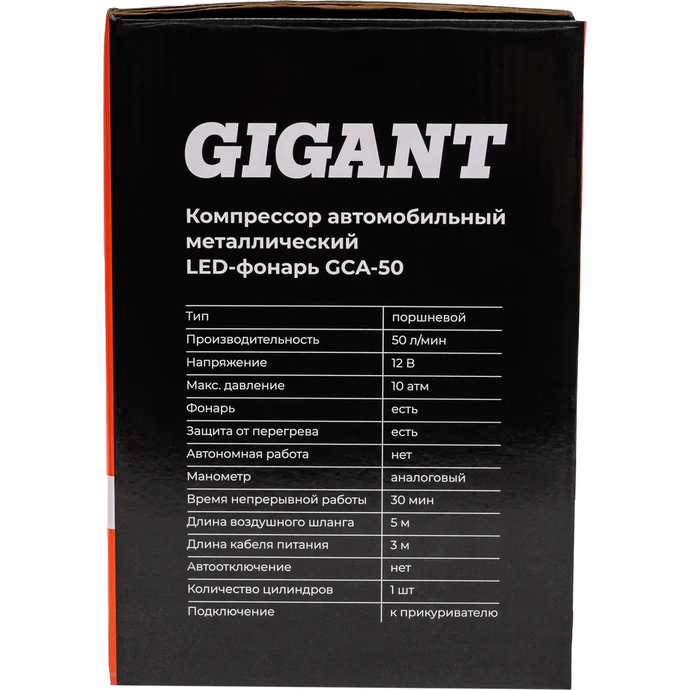 Автомобильный компрессор Gigant металл, 12V, LED фонарь GCA-50 отлично подходит для дальних поездок и путешествий. Устройство позволяет легко и быстро накачать шины автомобиля или велосипеда, а также различные надувные изделия. Встроенный LED фонарь обеспечивает комфортное использование компрессора в темное время суток. Визуальный контроль - встроенный манометр позволяет контролировать рабочее давление; Удобное перемещение - в конструкции предусматривается транспортировочная рукоять для легкого и удобного перемещения агрегата с одного места на другое; Широкие возможности - в стандартную комплектацию входит набор насадок для накачивания велосипедных шин, матрацев, мячей и резиновых лодок.