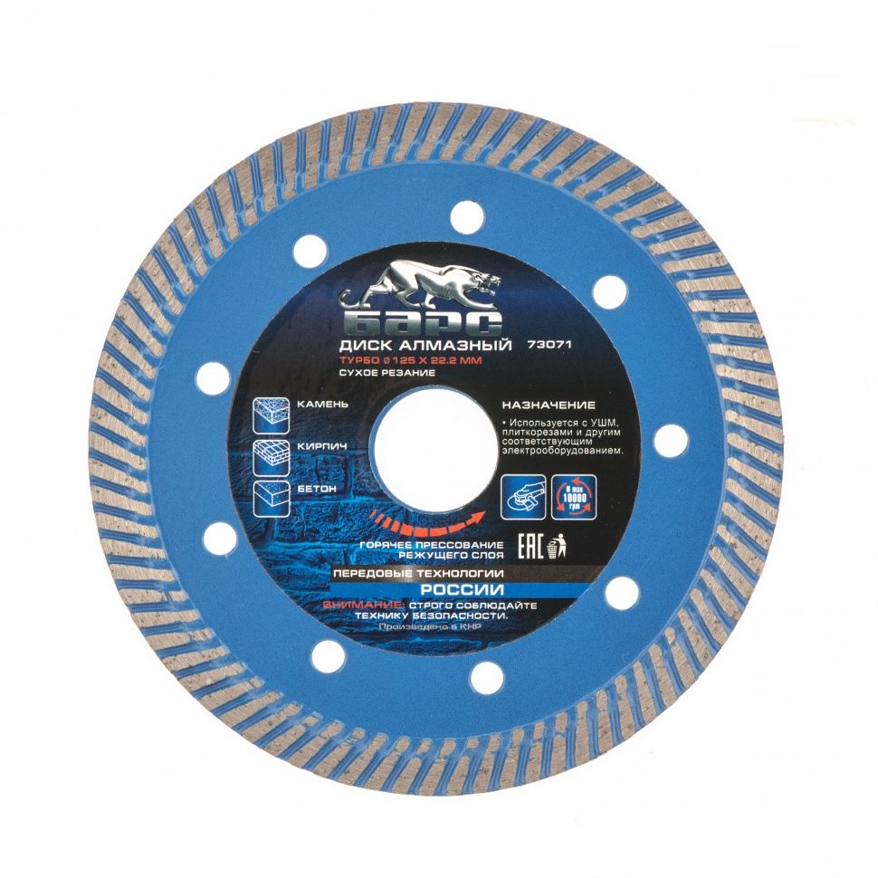 Алмазный диск Барс Турбо диаметром 125 мм и с посадочным диаметром 22,2 мм (модель 73071) идеально подходит для осуществления сухого резания различных строительных материалов. Он эффективно справляется с бетоном, в том числе свежезалитым, среднеармированным железобетоном, камнем, кирпичом, гранитом и песчаником. Этот диск совместим с угловыми шлифмашинами (УШМ), обеспечивая удобство в работе.