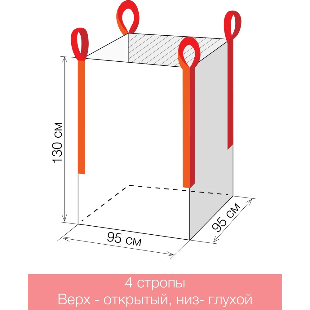 Биг-бэг Gigant G-30-06-006 представляет собой прочный мягкий контейнер из прочного полипропилена с глухим дном и открытым верхом. В такой конструкции нет элемента, закрывающего контейнер. В разложенном виде имеет размер 95x95x130 см. Для перемещения с помощью грузоподъемного оборудования имеются 4 стропы (ручки), которые дают возможность легко и надежно поднимать и перемещать контейнер с помощью специального оборудования. Биг-бэг является одним из наиболее экономичных видов упаковки, при этом отличается большой грузоподъемностью и вместимостью. Широко применяется в химической и пищевой промышленностях, сельском хозяйстве, строительстве. Используется для хранения и транспортировки сыпучих грузов (например, цемента, песка, щебня, сахара, муки, зерна), для складирования вторичного сырья, вывоза мусора и т.д.
