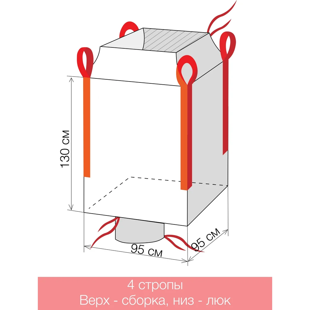 Биг-бэг Gigant G-30-06-010 представляет собой прочный мягкий контейнер из прочного полипропилена со специальным узким раструбом снизу для возможности проводить аккуратную разгрузку сыпучих материалов. В разложенном виде имеет размер 95x95x130 см. Для перемещения с помощью грузоподъемного оборудования имеются 4 стропы (ручки), которые дают возможность легко и надежно поднимать и перемещать контейнер с помощью специального оборудования. Биг-бэг является одним из наиболее экономичных видов упаковки, при этом отличается большой грузоподъемностью и вместимостью. Широко применяется в химической и пищевой промышленностях, сельском хозяйстве, строительстве. Используется для хранения и транспортировки сыпучих грузов (например, цемента, песка, щебня, сахара, муки, зерна), для складирования вторичного сырья, вывоза мусора и т.д.