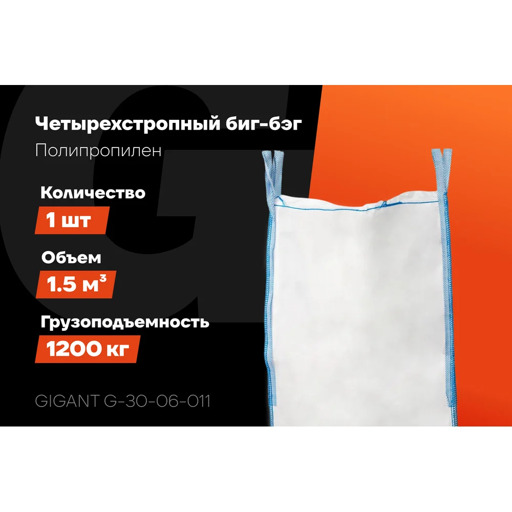 Биг-бэг Gigant G-30-06-011 представляет собой надежное решение для транспортировки и хранения различных материалов. Изготовленный из прочного полипропилена, он обеспечивает высокую грузоподъемность. Конструкция с четырьмя стропами облегчает процесс погрузки и разгрузки, а верх-сборка обеспечивает удобство заполнения. Глухой низ предотвращает утечку содержимого, что гарантирует безопасность при транспортировке.
