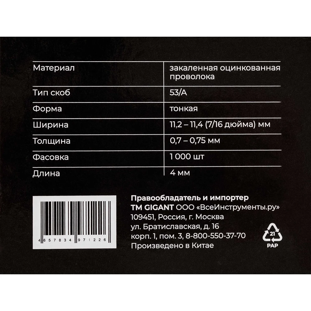 Cкобы для мебельного степлера тип 53 4x0,7, 1000 шт./уп Gigant GSMS-10 рассчитаны на скрепление материалов. Применяются в ходе проведения ремонтных и отделочных работ, пригодятся при обшивке мебели. Поставляются в наборе по 1000 штук, имеют тонкую форму, длину - 4 мм, толщину - 0,7 - 0,75 мм и ширину 11.2-11.4 мм. Скобы изготовлены из закаленной оцинкованной проволоки. Подходят для работы с древесиной, фанерой, картоном, ДСП, оргалитом и т.д. Имеют высокую пробивную способность. Обеспечивают надежное и долговечное крепление.