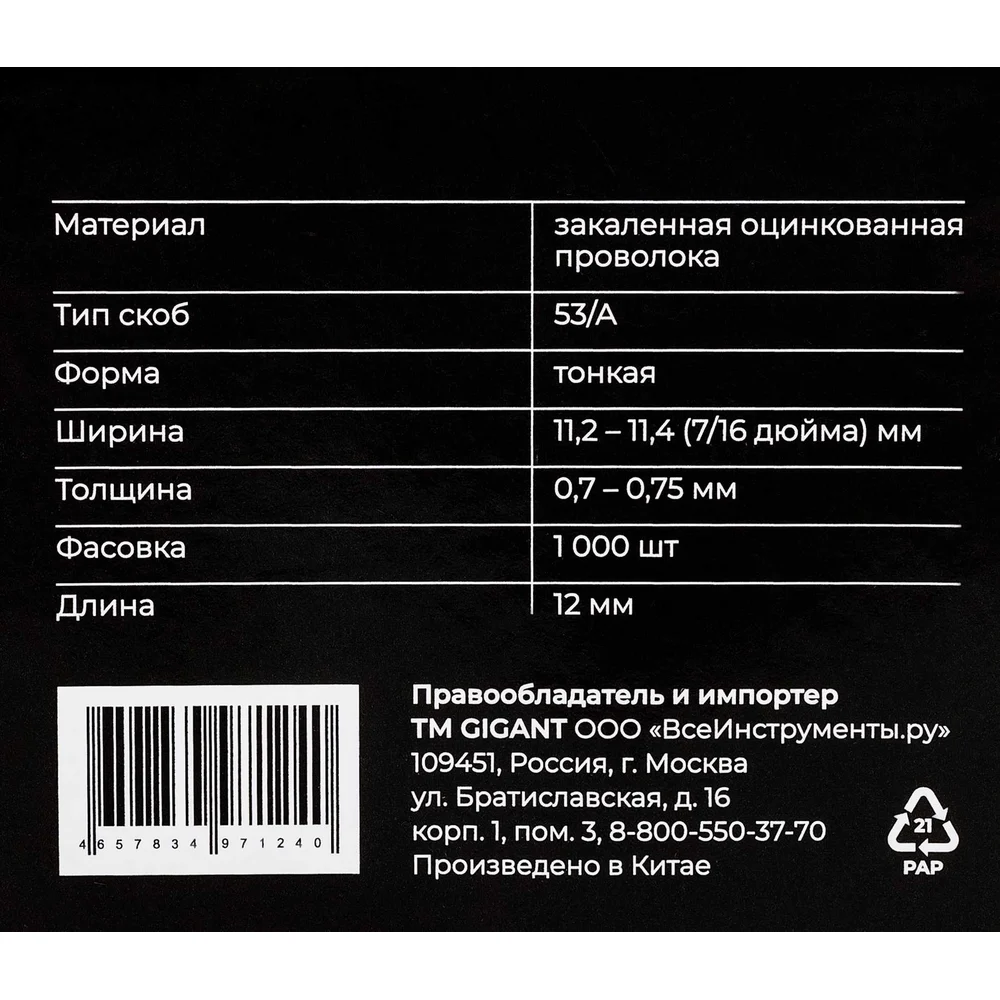 Cкобы для мебельного степлера тип 53 12x0,7 мм, 1000 шт./уп Gigant GSMS-12 рассчитаны на скрепление материалов. Применяются в ходе проведения ремонтных и отделочных работ, пригодятся при обшивке мебели. Поставляются в наборе по 1000 штук, имеют тонкую форму, длину - 12 мм, толщину - 0,7 - 0,75 мм и ширину 11.2-11.4 мм. Скобы изготовлены из закаленной оцинкованной проволоки. Подходят для работы с древесиной, фанерой, картоном, ДСП, оргалитом и т.д. Имеют высокую пробивную способность. Обеспечивают надежное и долговечное крепление.