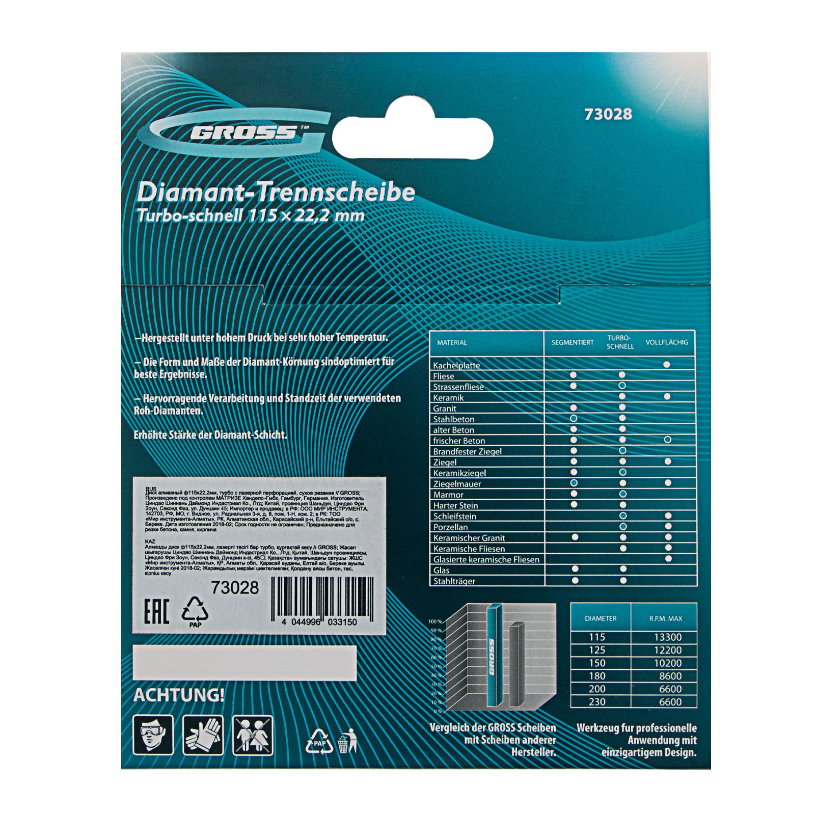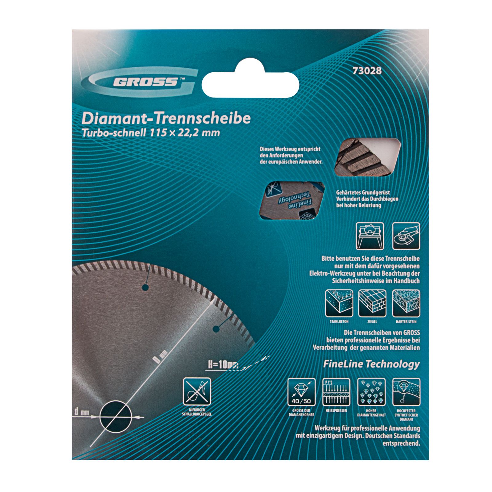 Алмазный диск Gross ф115 х 22,2 мм 73028 турбо с лазерной перфорацией применяется для сухого резания твердых материалов: бетона, в том числе свежего, железобетона, кирпича, гранита, камня и песчаника. Возможность работы с разными типами материалов обусловлена оптимально подобранной металлической связкой. Инструмент используется в качестве расходника на профессиональных УШМ. Лазерная перфорация обеспечивает усиленное охлаждение диска, поэтому он оптимален для интенсивной эксплуатации.