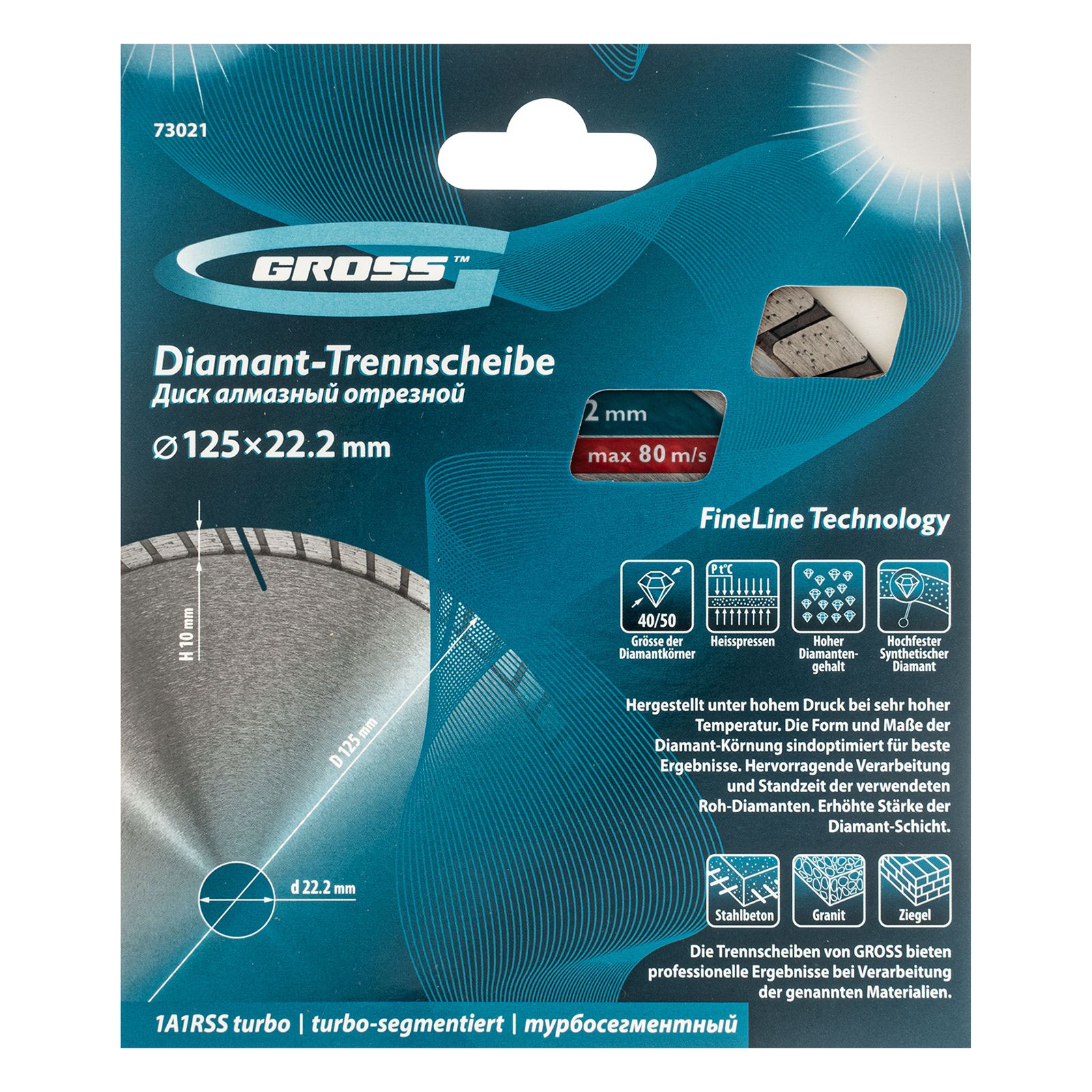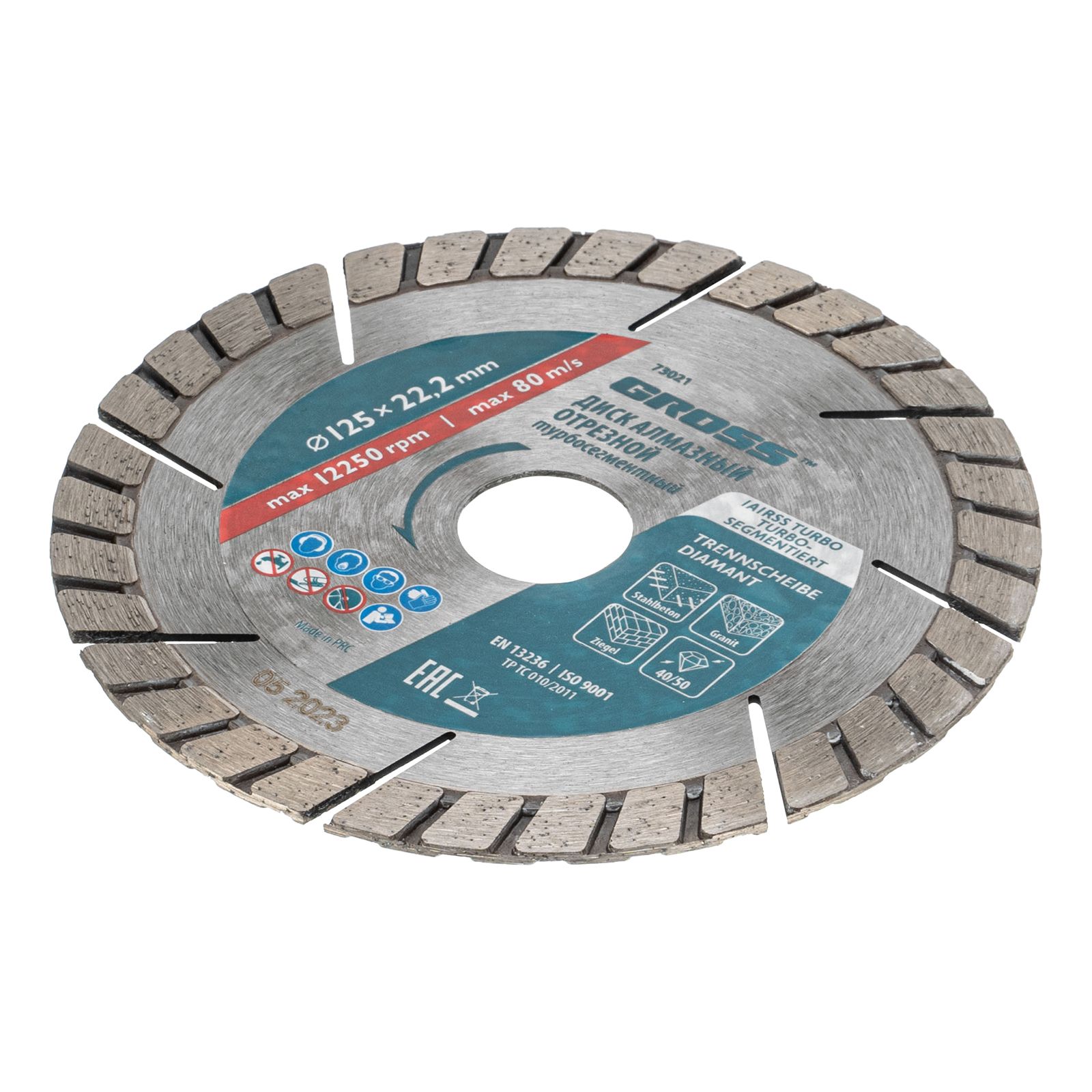 Алмазный турбо-сегментный диск Gross 73021 диаметром 125 х 22,2 мм для сухого резания — оснастка для УШМ со скоростью вращения до 12250 об/мин, предназначенная для отрезных работ. Универсальный диск с турбированной рабочей частью можно использовать для резки камня, гранита и кирпича, свежего бетона, а также слабоармированного железобетона. Он подходит для профессионального использования.