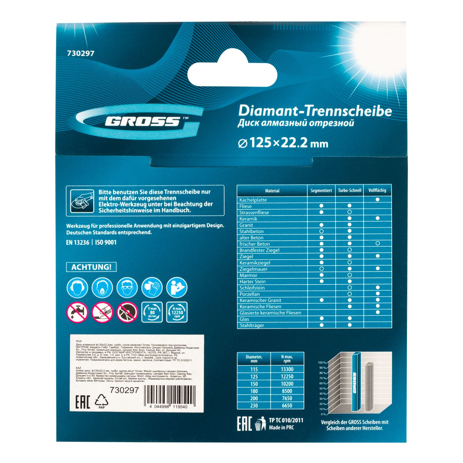 Алмазный диск Gross 730297 диаметром 125 х 22,2 мм, с рабочей частью «турбо», применяется для сухой резки твердых материалов: бетона, в том числе свежего, среднеармированного железобетона, кирпича, гранита, камня и песчаника. Работа с разными типами материалов возможна благодаря оптимально подобранной металлической связке. Инструмент используется в качестве расходника на профессиональных УШМ.