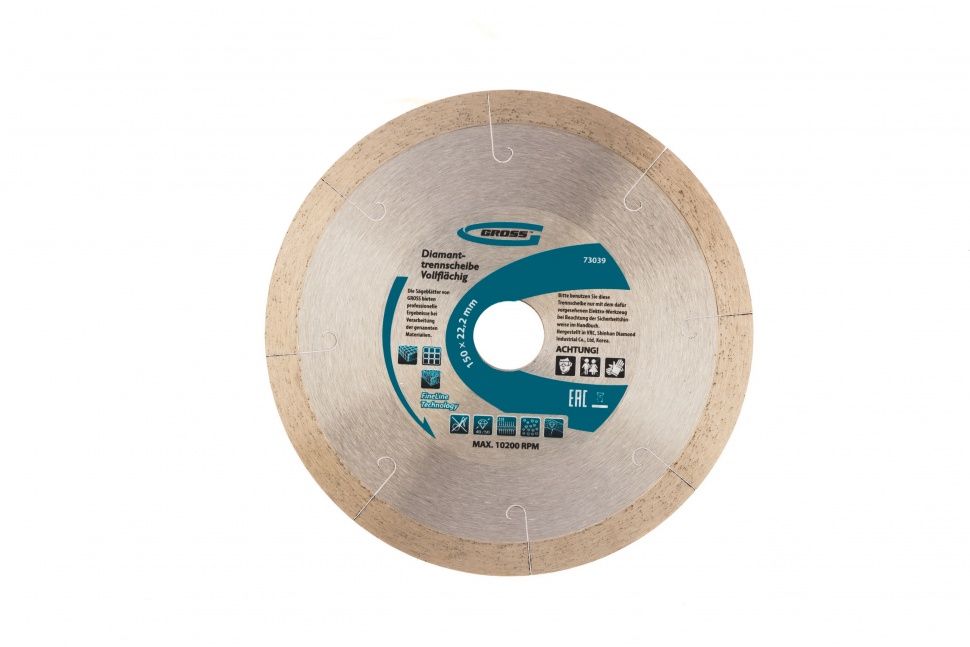 Сплошной алмазный диск Gross 73039 диаметром 150 х 22,2 мм, с лазерной перфорацией, предназначен для мокрой резки и используется в качестве расходника на УШМ или плиткорезах с посадочным размером 22,2 мм. Металлическая связка с оптимальным соотношением серебра, кобальта и других качественных компонентов позволяет работать с гранитом, керамикой, керамогранитом, мрамором, натуральным и искусственным камнем. Метод мокрой резки подразумевает использование водяного охлаждения, что способствует снижению перегрева и эффективному отводу пыли.