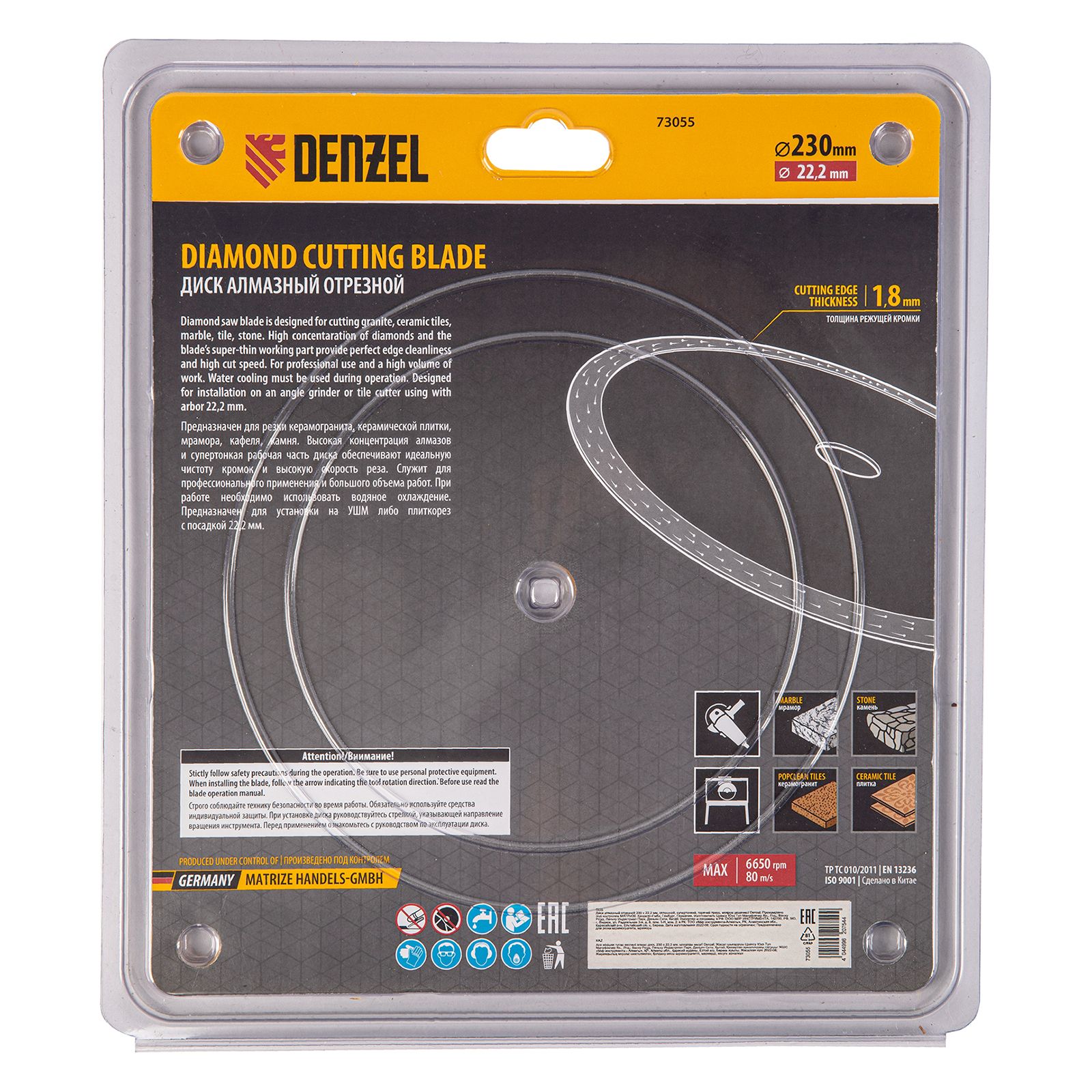 Алмазный диск ТМ Denzel "Сплошной" арт 73055, ф230 х 22,2 мм, предназначен для мокрого резания мрамора, керамогранита и керамическую плитки, камня. Устанавливается на УШМ (болгарку) или плиткорез с посадочным диаметром 22,2 мм. Высокая концентрация алмазов и супертонкая рабочая часть диска обеспечивает идеальную частоту кромок и высокую скорость реза.Диск произведен по технологии горячего прессования с увеличенной шириной режущей кромки (10мм) подходит для профессионального использования и больших объемов работ.