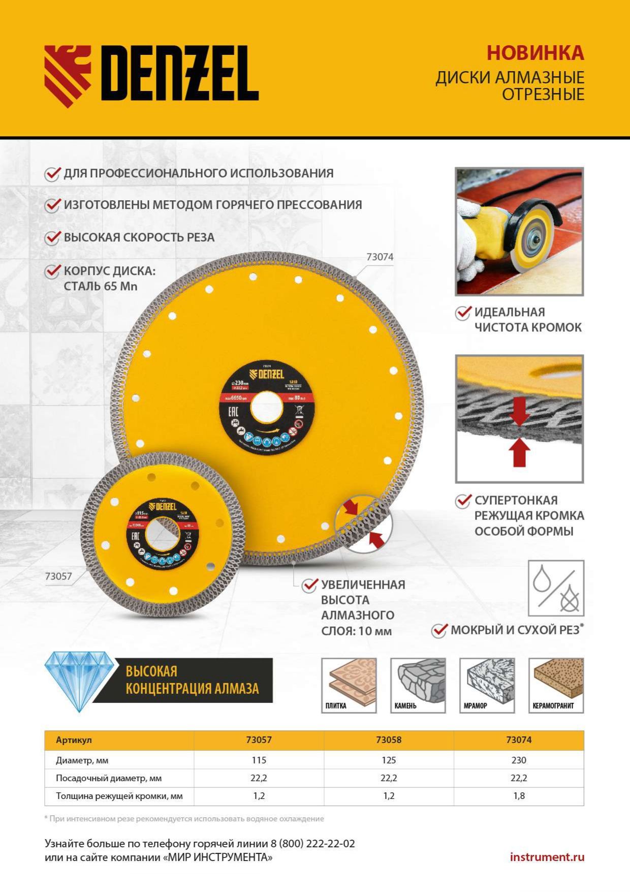 Алмазный диск ТМ Denzel "Сплошной" арт 73074, ф230 х 22,2 мм, предназначен для резания мрамора, керамогранита и керамическую плитки, камня. Устанавливается на УШМ (болгарку) или плиткорез с посадочным диаметром 22,2 мм. Высокая концентрация алмазов и супертонкая рабочая часть диска обеспечивает идеальную частоту кромок и высокую скорость реза.Особая сплошная форма режущей части позволяет использовать диск без водяного охлаждения для кратковременного реза.Диск произведен по технологии горячего прессования с увеличенной шириной режущей кромки (10мм) подходит для профессионального использования и больших объемов работ. При интенсивной резке необходимо использовать водяное охлаждение.