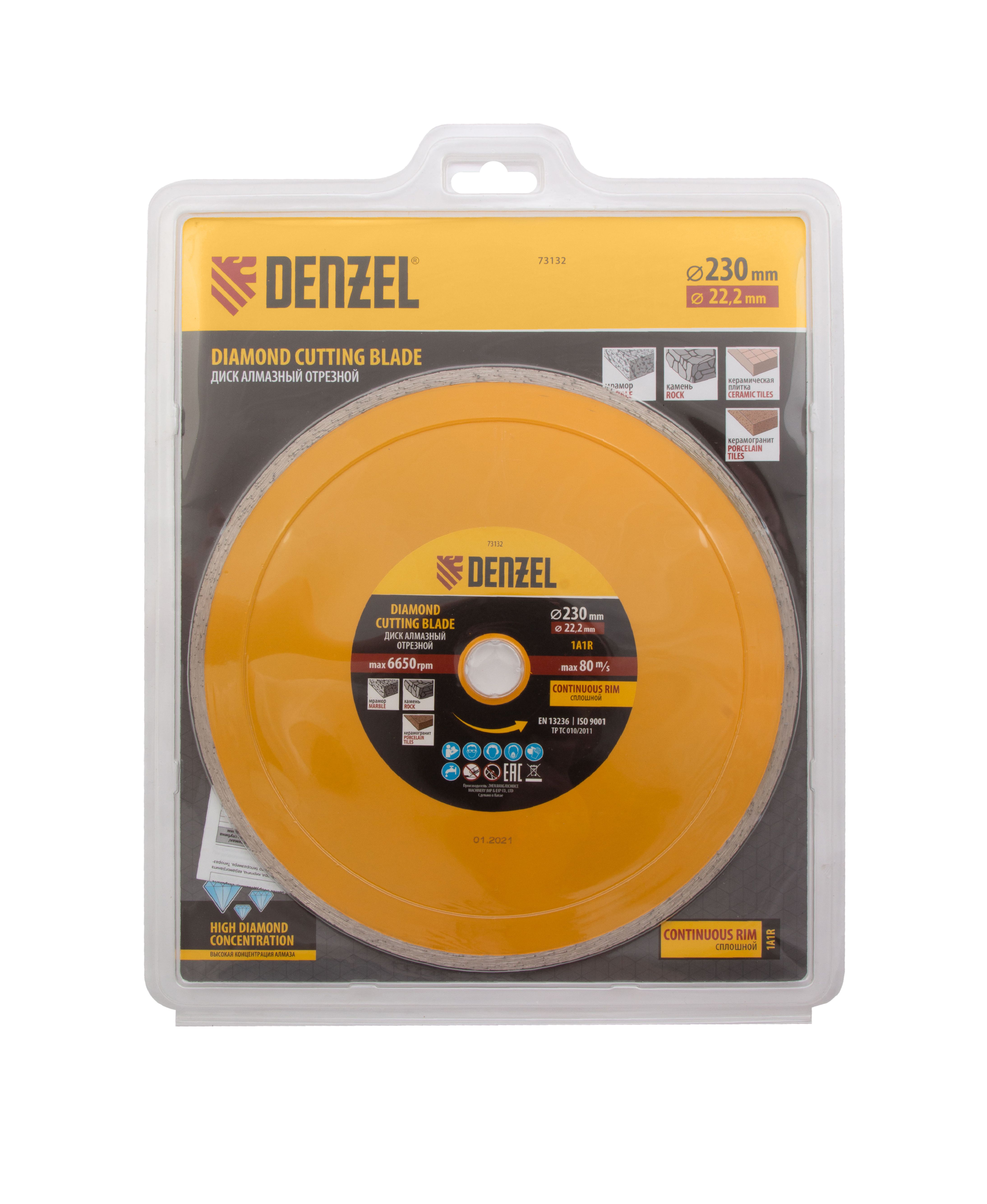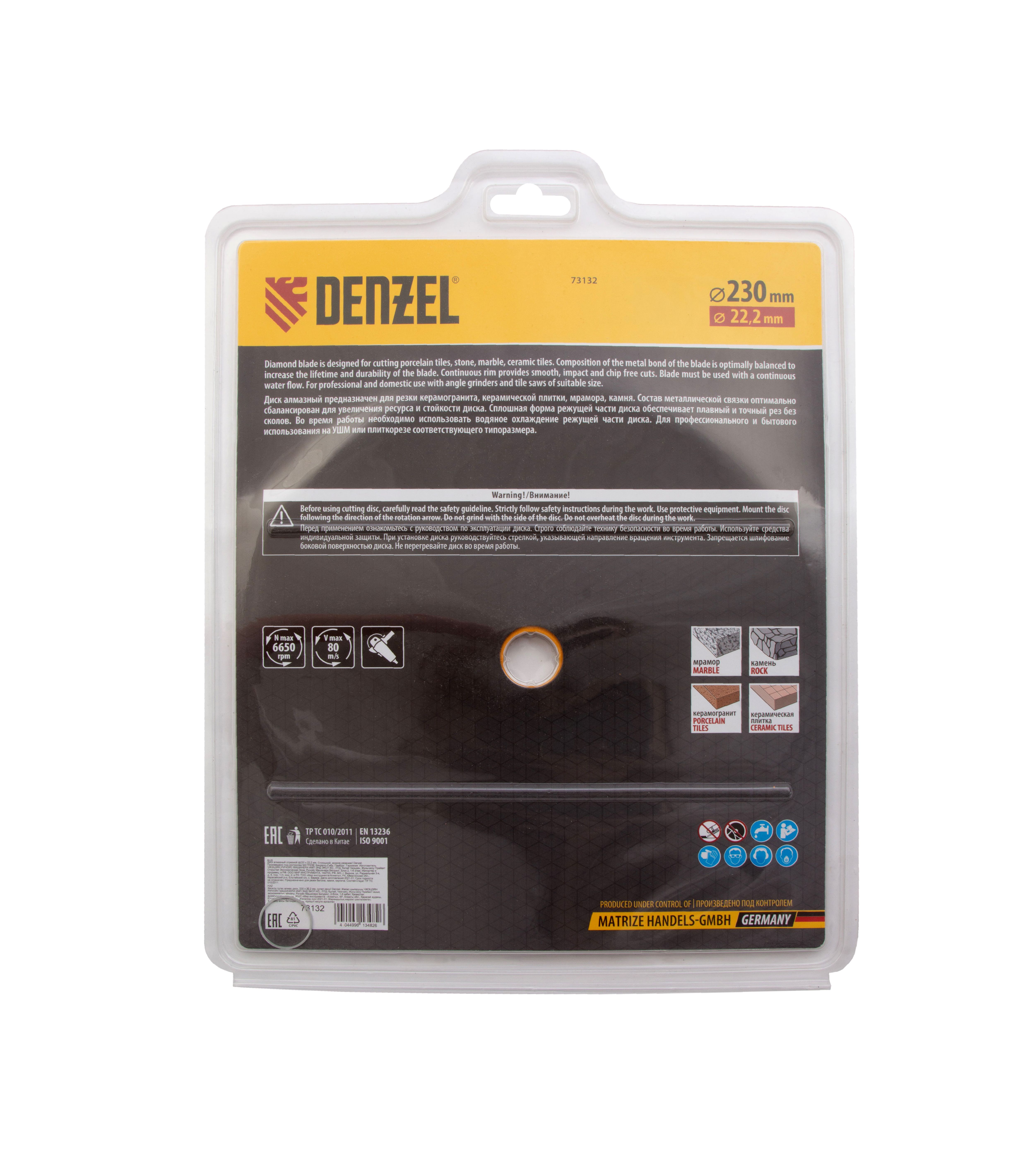 Отрезной алмазный диск Denzel «Сплошной» 73132 диаметром 230 х 22,2 мм используется для «мокрого» резания совместно с углошлифовальной машиной или плиткорезом с соответствующим посадочным диаметром. Режет камень, мрамор, керамогранитную и керамическую плитку. Диск отличается хорошей производительностью за счет высокой скорости реза, поэтому подходит для профессионального применения.