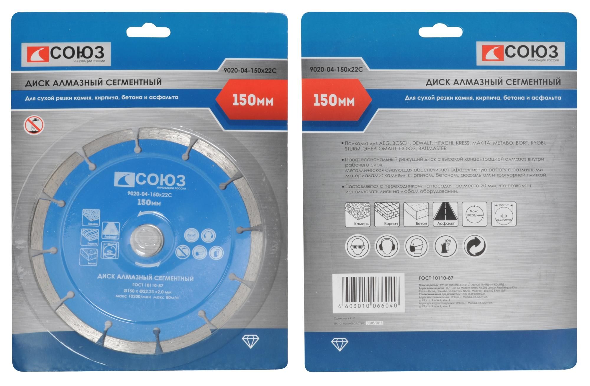 Диск алмазный СОЮЗ 9020-04-150x22C предназначен для сухой резки таких материалов, как кирпич, камень и неармированный бетон. В результате использования этого инструмента вы сможете легко и эффективно выполнить множество строительных и ремонтных задач.