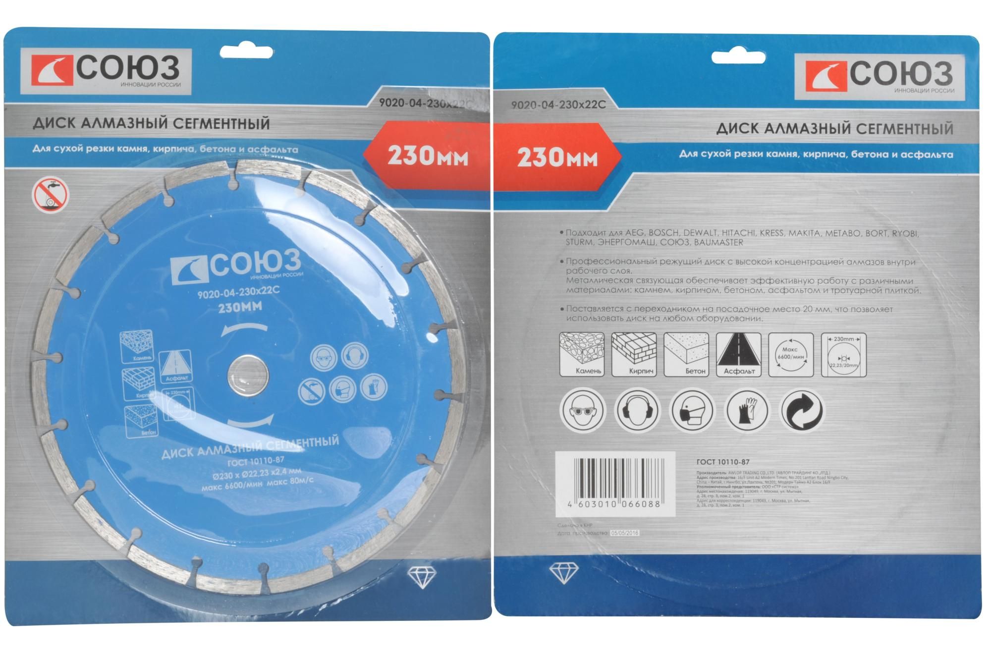 Диск алмазный СОЮЗ 9020-04-230x22C предназначен для эффективной сухой резки таких материалов, как кирпич, камень и неармированный бетон.