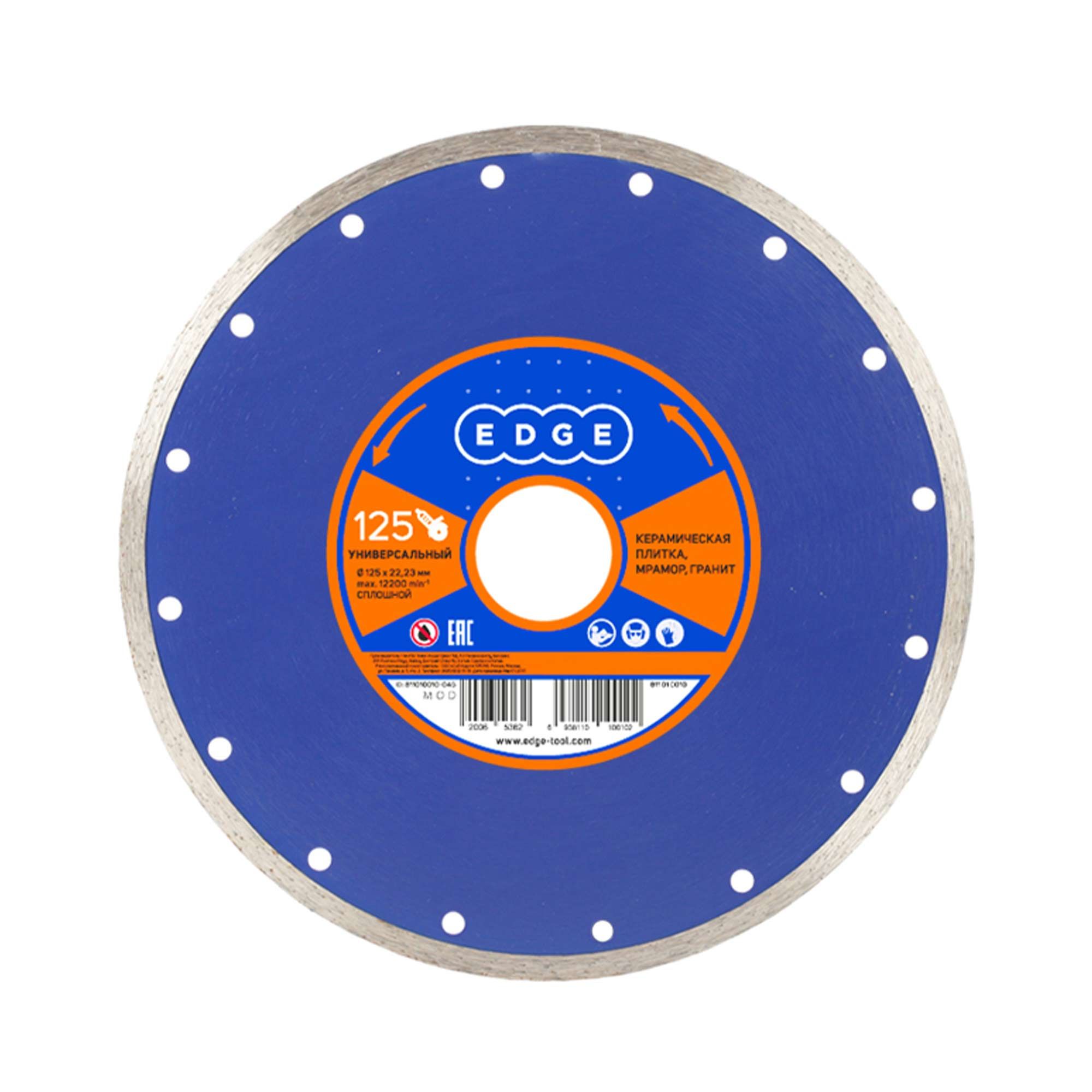 Наружный диаметр: 125 мм;Внутренний диаметр: 22,23мм; Толщина алмазного слоя:2.3мм Высота алмазного слоя: 7мм Обрабатываемый материал: керамическая плитка, мрамор, гранит Работа с водой: нет