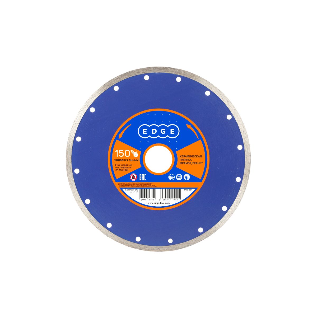Наружный диаметр: 150 мм; Внутренний диаметр:22,23мм; Толщина алмазного слоя:2.3мм Высота алмазного слоя: 7мм Обрабатываемый материал: керамическая плитка, мрамор, гранит Работа с водой: нет