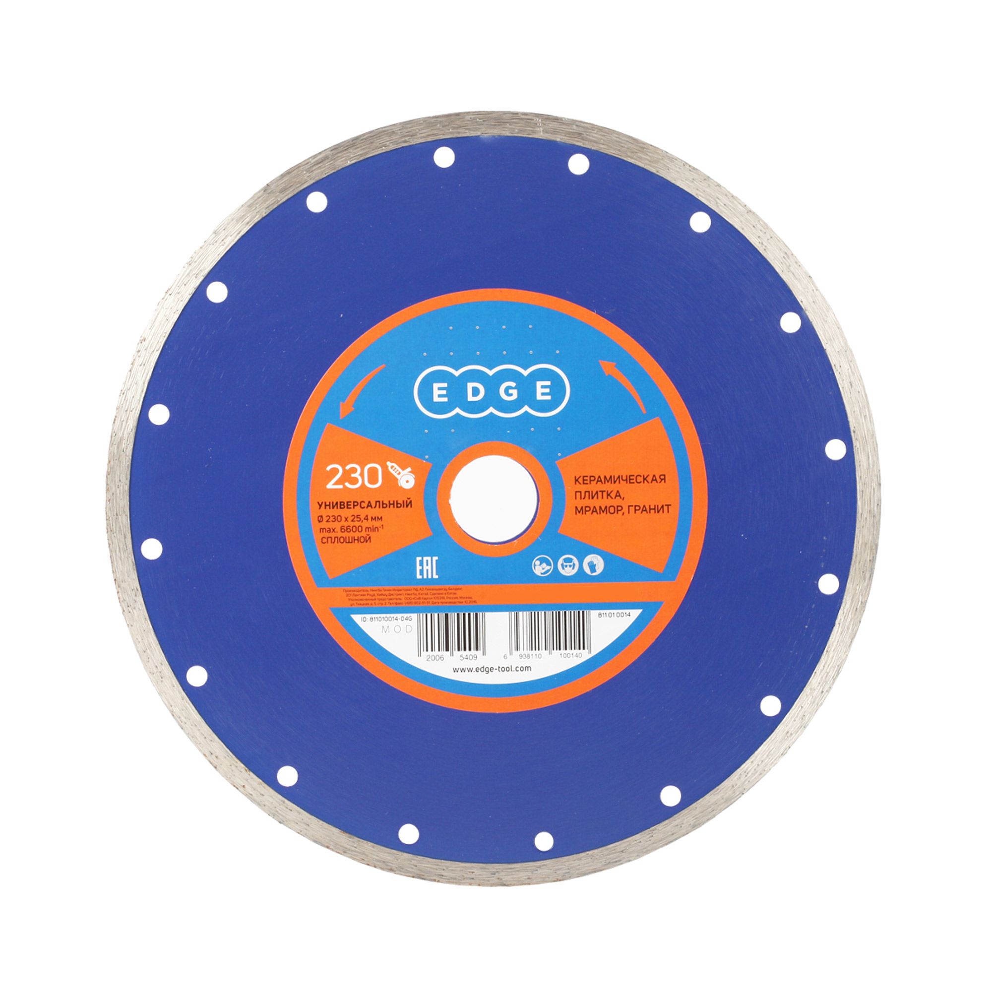 Наружный диаметр: 230 мм; Внутренний диаметр: 25,4мм; Толщина алмазного слоя:2.7мм Высота алмазного слоя: 7мм Обрабатываемый материал: керамическая плитка, мрамор, гранит Работа с водой: да