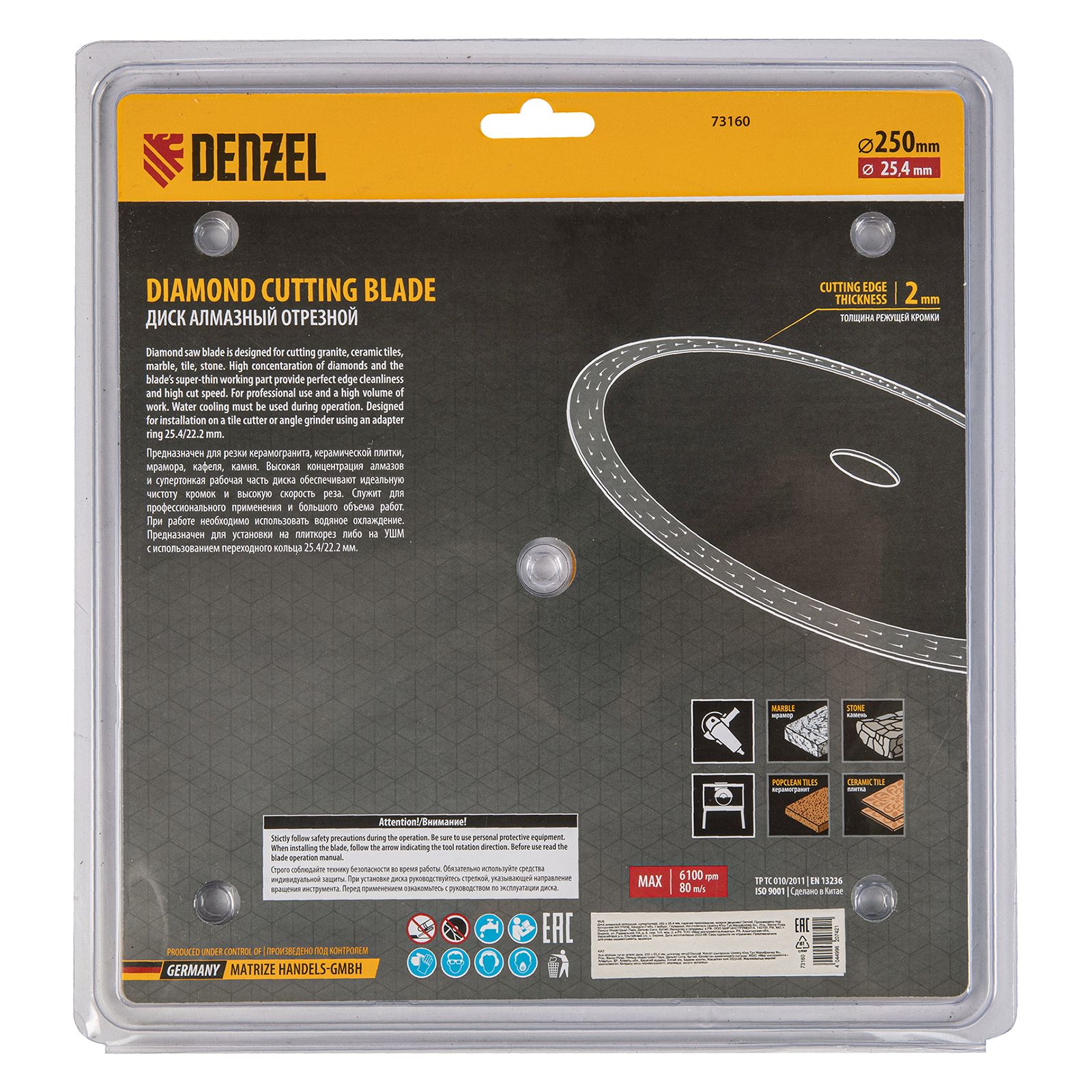 Алмазный диск ТМ Denzel "Сплошной" арт 73160, ф250 х 25,4 мм, предназначен для мокрого резания мрамора, керамогранита и керамическую плитки, камня. Устанавливается на плиткорез или УШМ (болгарку) с посадочным диаметром 25,4 мм. Высокая концентрация алмазов и супертонкая рабочая часть диска обеспечивает идеальную частоту кромок и высокую скорость реза.Диск произведен по технологии горячего прессования с увеличенной шириной режущей кромки (10мм) подходит для профессионального использования и больших объемов работ.