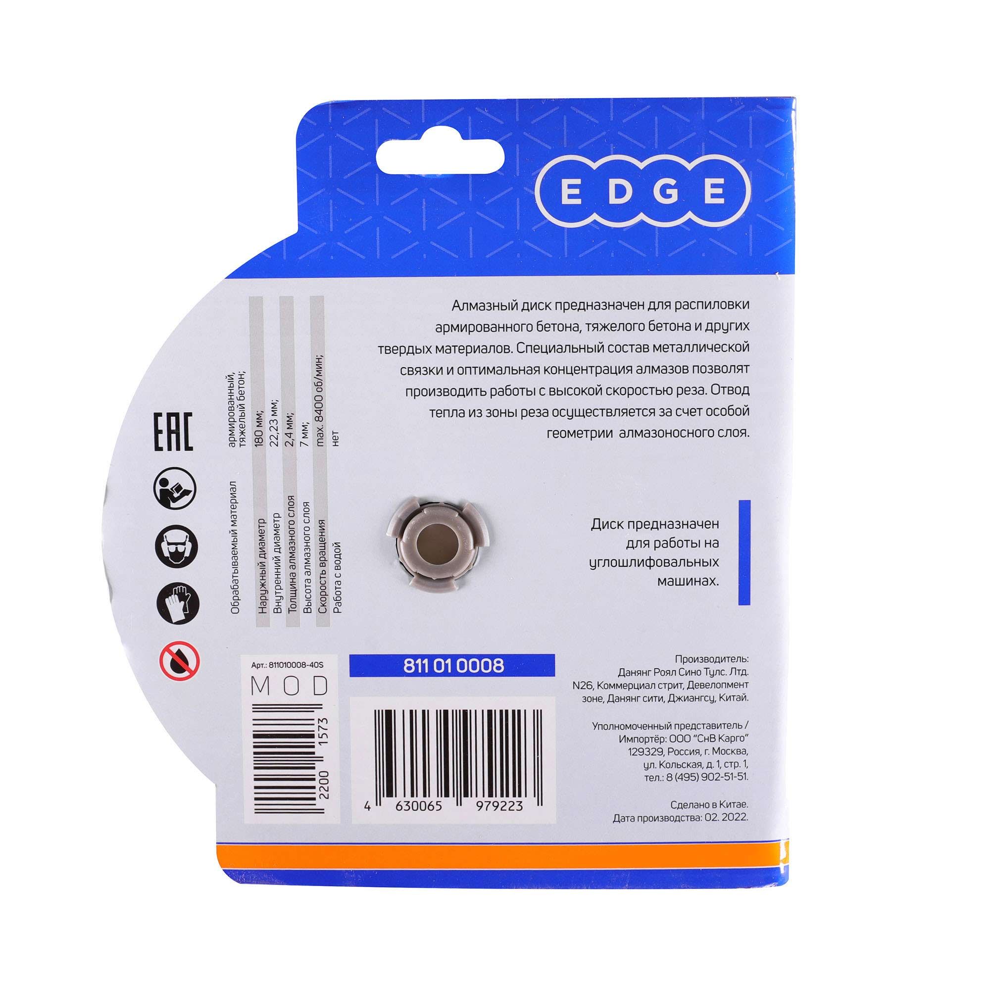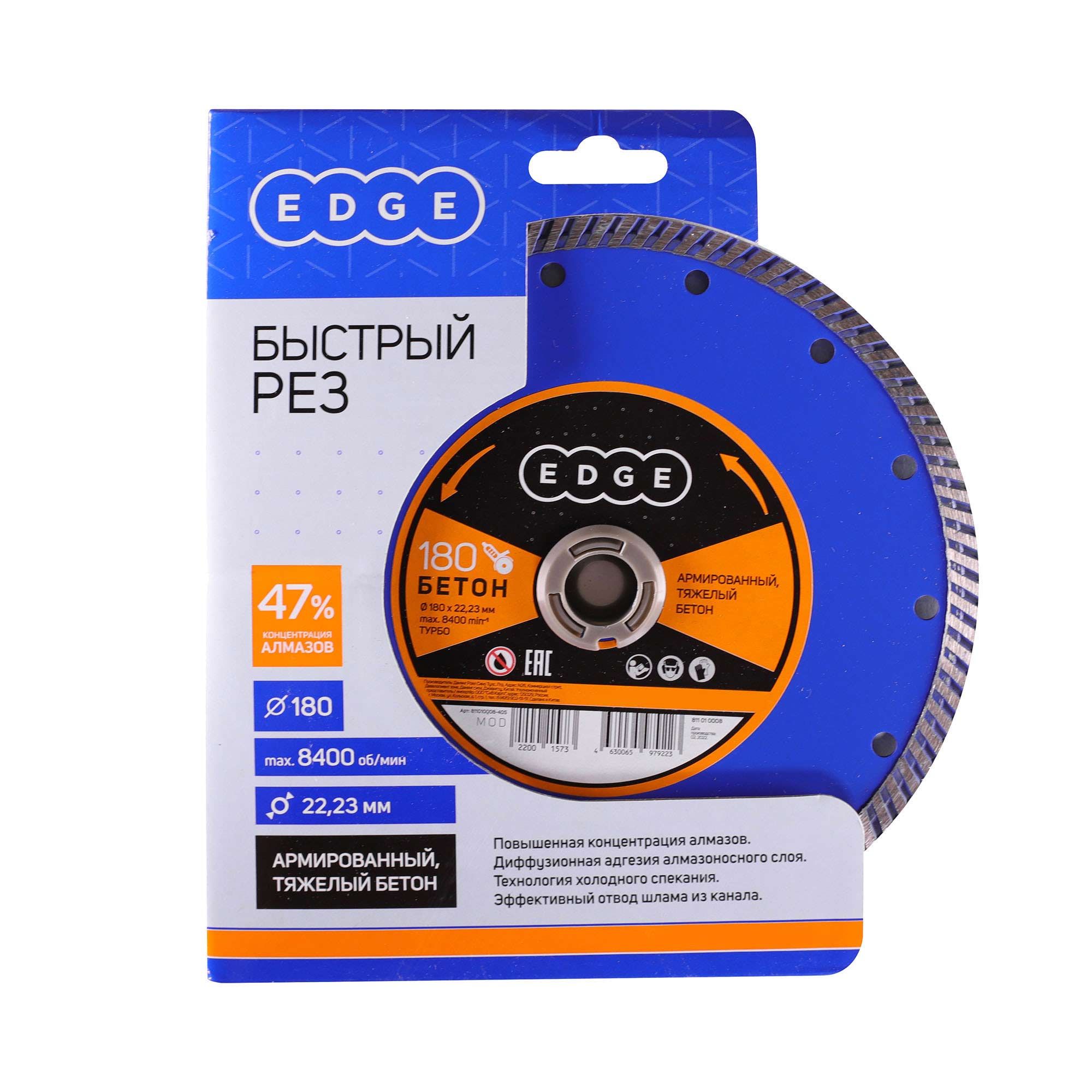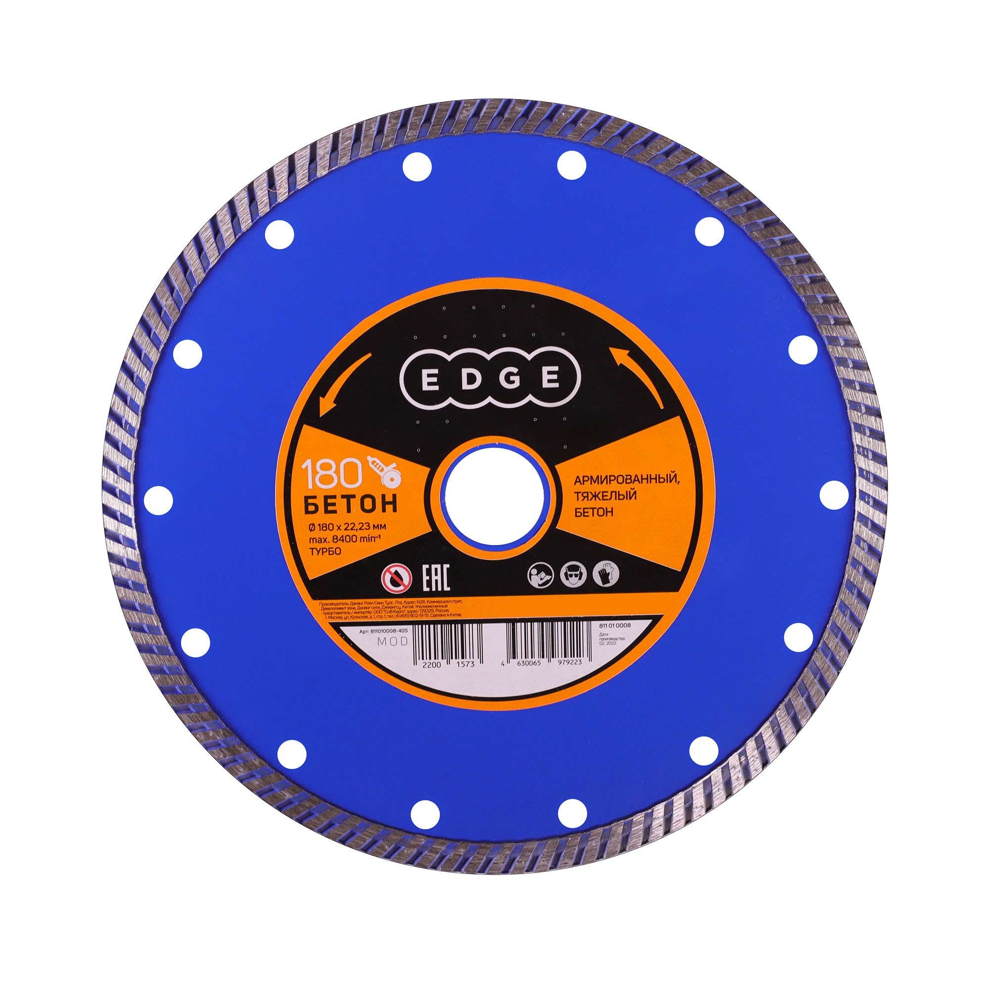 Наружный диаметр: 180 мм; Внутренний диаметр: 22,23мм; Толщина алмазного слоя:2,6мм Высота алмазного слоя: 7мм Обрабатываемый материал: армированный бетон, тяжелый бетон Работа с водой: нет