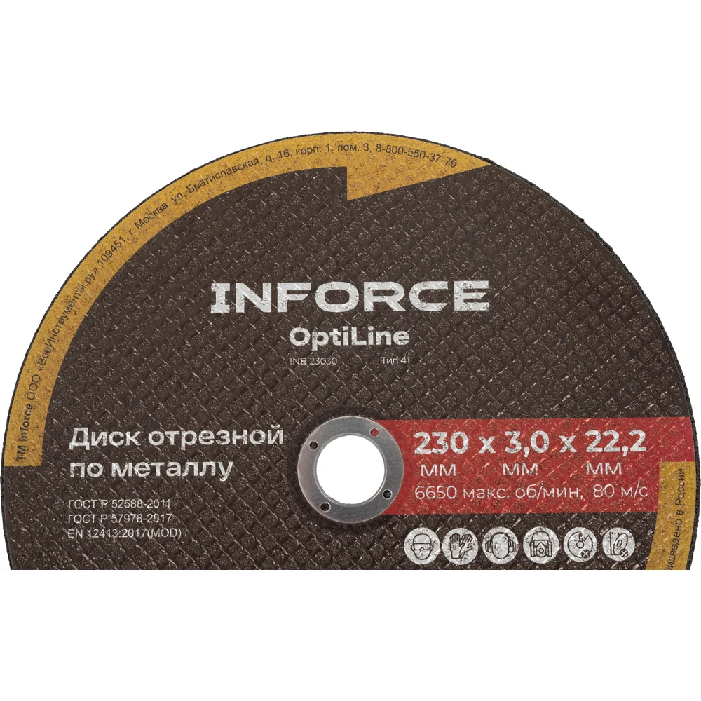 Диск отрезной по металлу OptiLine (230x3.0x22.2 мм) упаковка 20шт. Inforce INB23030-20 является сменным элементом для угловых шлифовальных машин. Применяется для резки металлических изделий. Диск обладает высокой производительностью и большим ресурсом работы. Оснастка изготавливается на современном оборудовании под строгим контролем качества.
