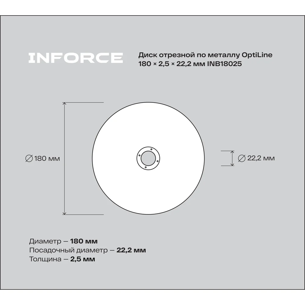 Диск отрезной по металлу OptiLine (180x2.5x22.2 мм) Inforce INB18025 является сменным элементом для угловых шлифовальных машин. Применяется для резки металлических изделий. Диск обладает высокой производительностью и большим ресурсом работы. Оснастка изготавливается на современном оборудовании под строгим контролем качества.