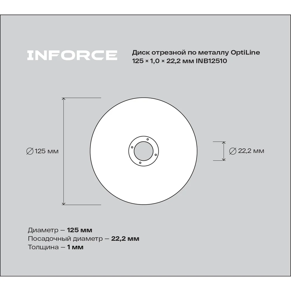 Диск отрезной по металлу OptiLine (125x1.0x22.2 мм) Inforce INB12510 является сменным элементом для угловых шлифовальных машин. Применяется для резки металлических изделий. Диск обладает высокой производительностью и большим ресурсом работы. Оснастка изготавливается на современном оборудовании под строгим контролем качества.