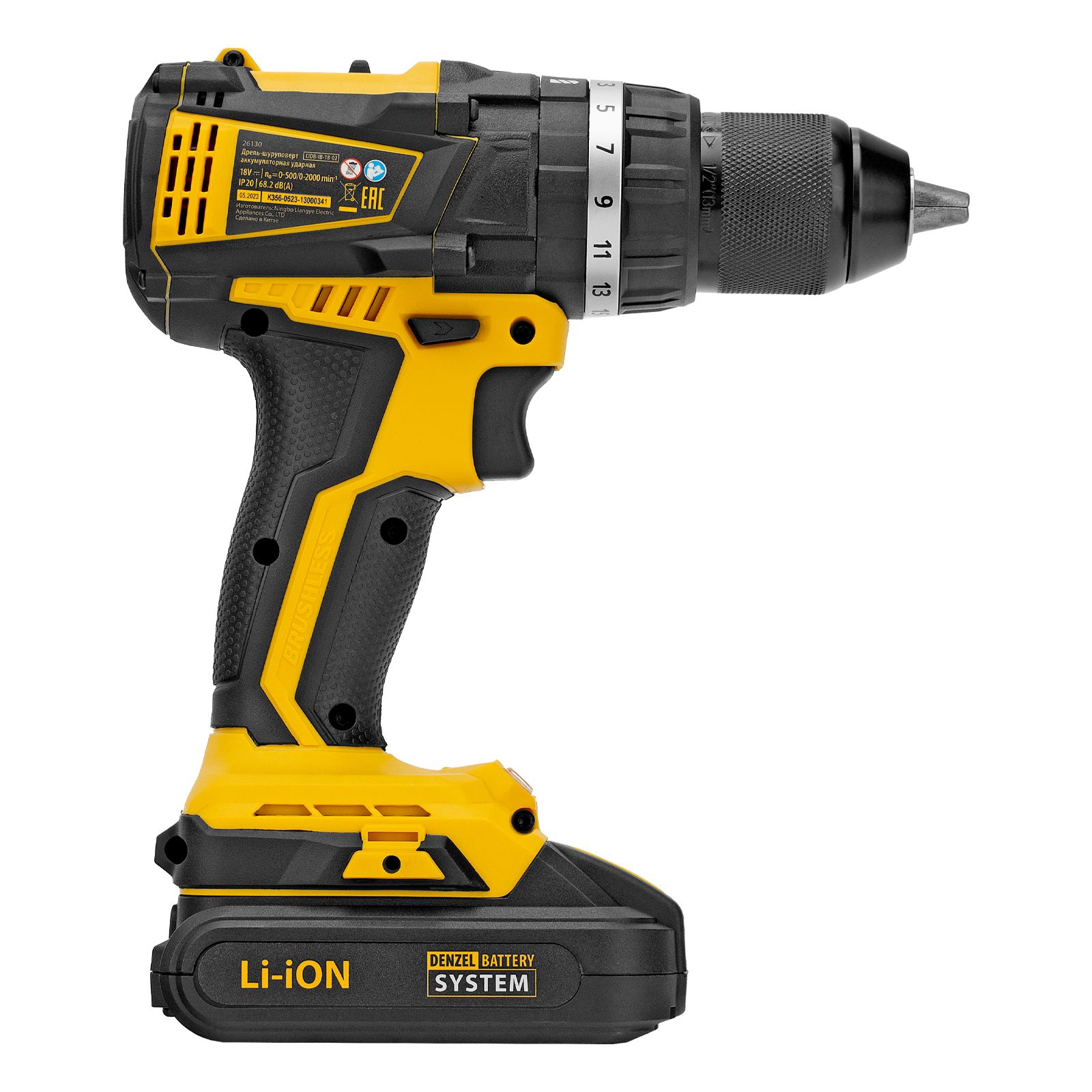 Дрель-шуруповерт аккумуляторная ударная Denzel CIDB-IB-18-02 26130 оснащена бесщеточным двигателем и поставляется с 2 аккумуляторами Li-Ion 18 В. Предназначена для закручивания и откручивания винтов и шурупов, а также для сверления отверстий в металлических, деревянных, пластиковых и других конструкциях. Мощный бесщеточный двигатель обеспечивает крутящий момент 65 Нм, ударная функция позволяет сверлить отверстия в кирпиче и прочих твердых материалах. Максимальный диаметр сверления в металле составляет 13 мм, в древесине — 35 мм, в кирпиче — 13 мм. Аккумуляторы с интеллектуальной системой распознавания нагрузки обеспечивают стабильную работу дрели-шуруповерта на протяжении всего срока службы.