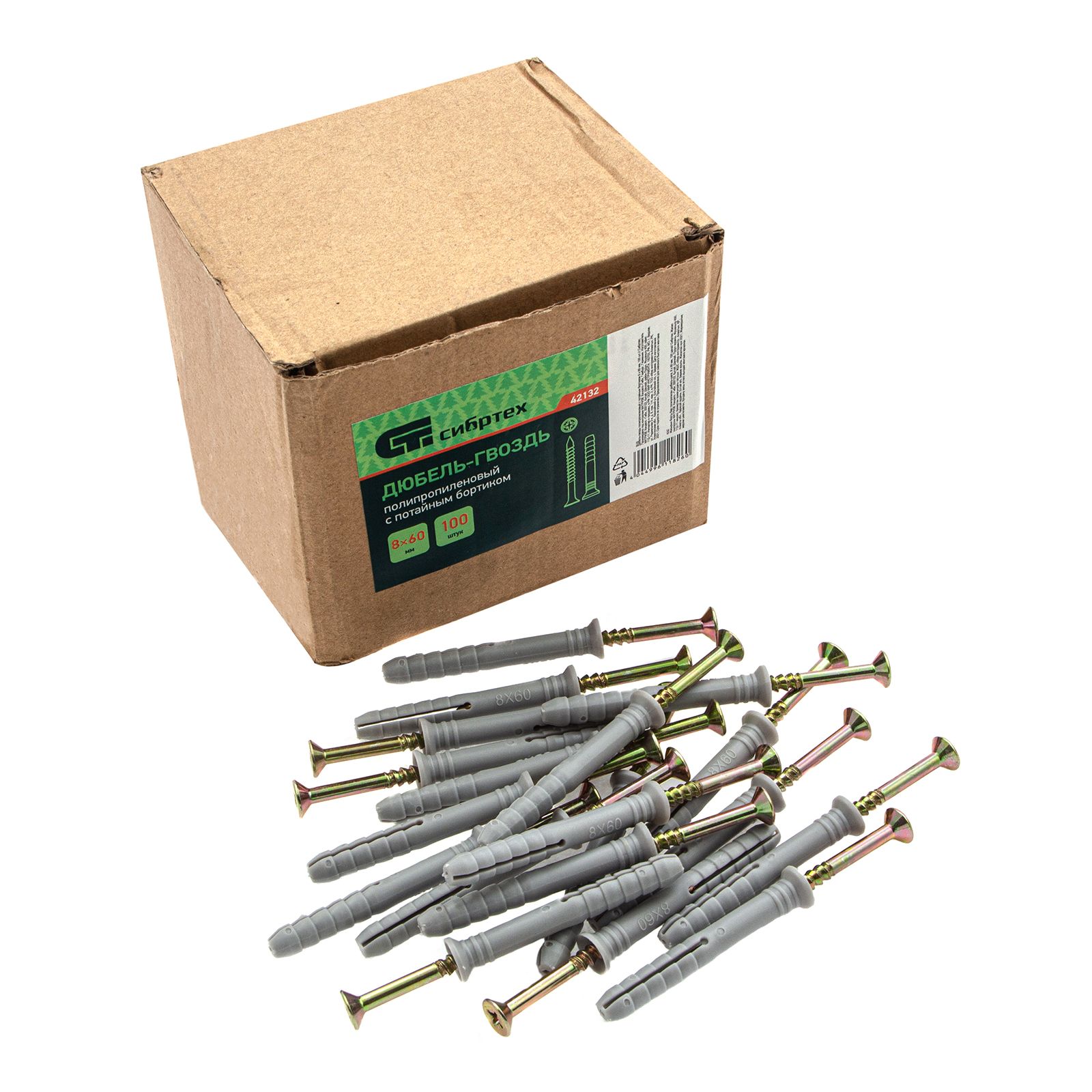 Полипропиленовый дюбель-гвоздь Сибртех 42132 с потайным бортиком, размером 8 х 60 мм, 100 шт. в упаковке, предназначен для закрепления деталей и конструкций на основаниях из бетона, кирпича или камня. Потайной бортик дюбеля обеспечивает максимальный контакт крепежа с прикрепляемым материалом. В комплект поставки входят саморезы со шляпкой типоразмера PZ2. Дюбель-гвоздь применяется при проведении строительных и ремонтных работ, прокладке сетей, а также для решения бытовых задач.