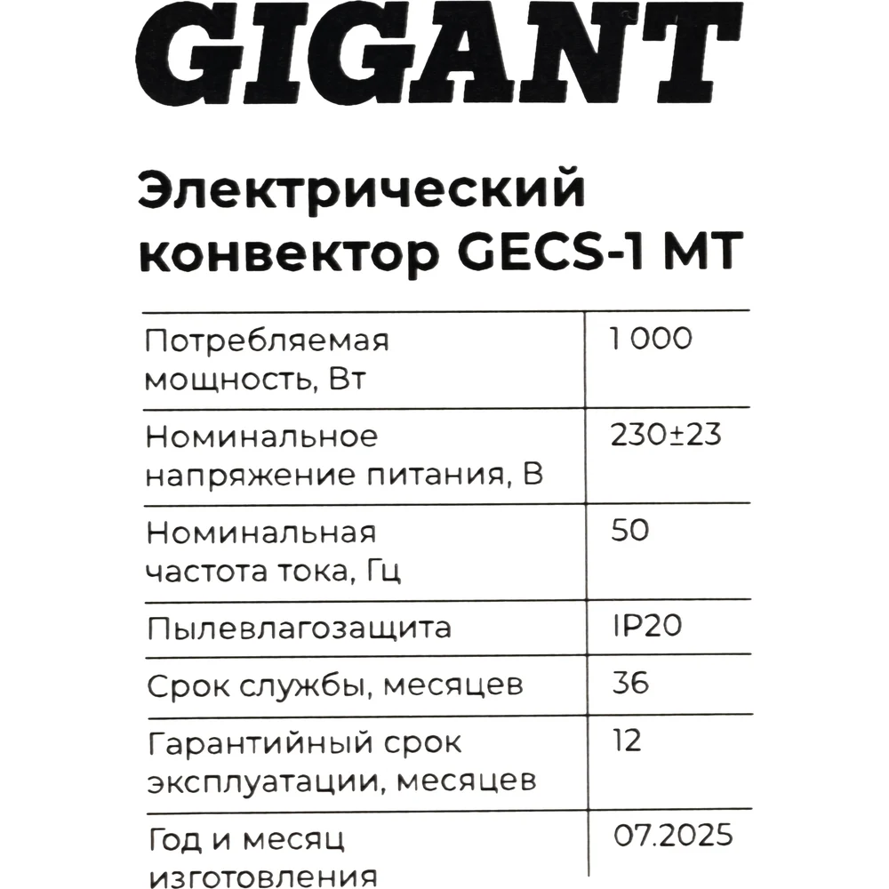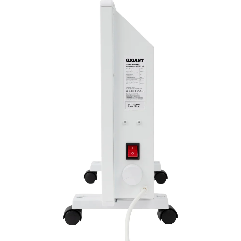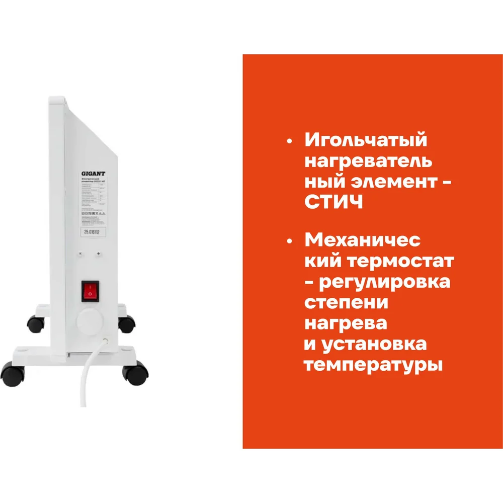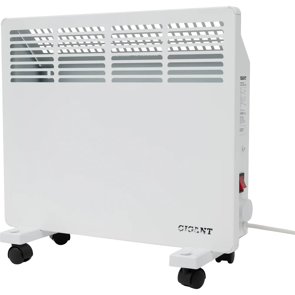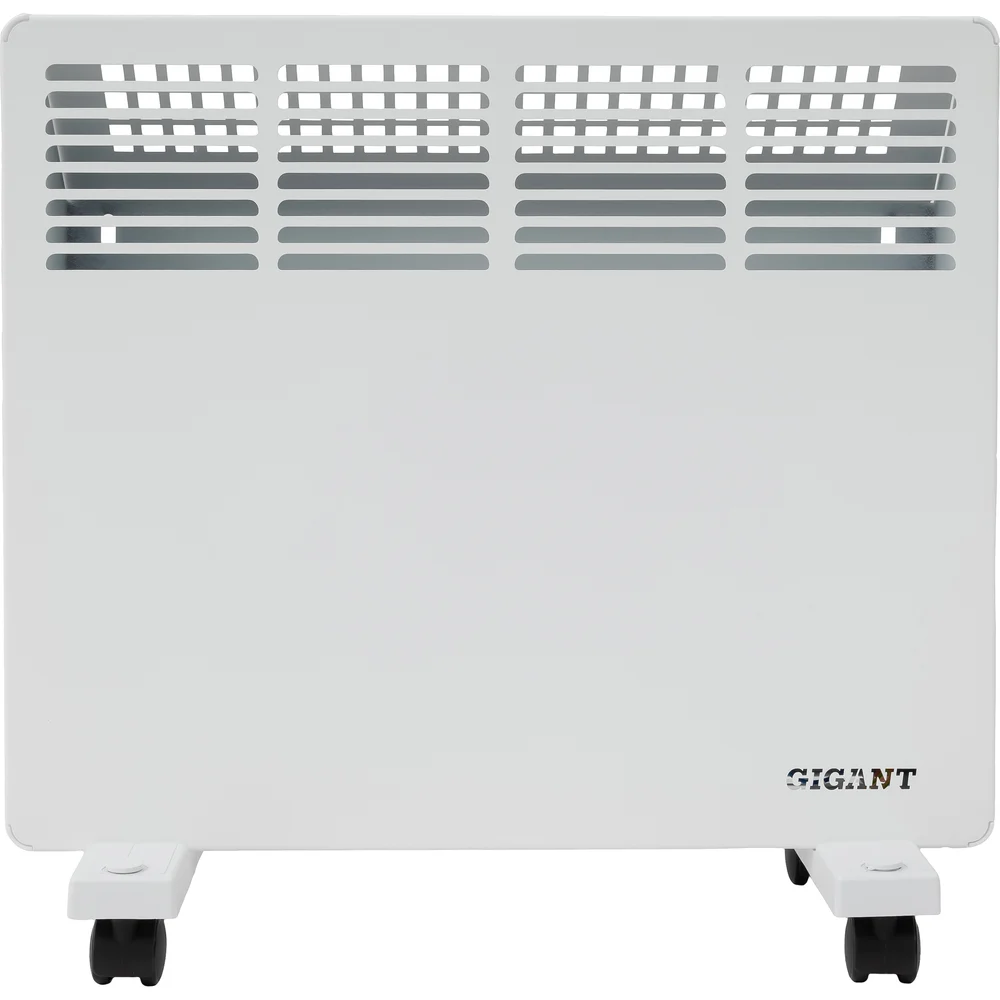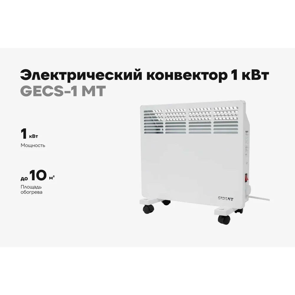 Электрический конвектор 1 кВт Gigant GECS-1 MT предназначен для обогрева жилых и бытовых помещений. Электроконвектор можно установить в комнате, гараже, на даче или небольшом складе, где есть сеть с напряжением 220-230В. Мощности 1000 Вт достаточно для обогрева площади до 10 кв. м. Внутри конвектора находится игольчатый нагревательный элемент — СТИЧ. Холодный воздух с пола проходит через конструкцию и за счет нагрева расширяется, устремляясь вверх. Благодаря наличию специальной решетки с жалюзи теплый поток естественным образом распределяется по всей территории и создает ускоренную циркуляцию. Степень нагрева и установка температуры электроконвектора регулируются за счет механического термостата.