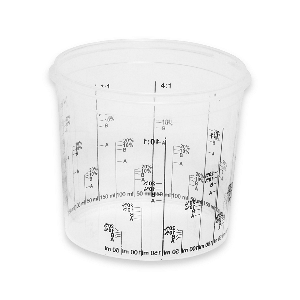 Емкость оснащена высококачественной градуировкой, позволяющей удобно и точно измерять необходимые пропорции для смешивания материалов в соотношениях 2:1, 3:1, 4:1, 5:1, 6:1, 7:1 и 10:1. Это исключает вероятность ошибок, так как объем отмеренных компонентов точно соответствует указанным значениям градуировки.