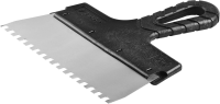 Благодаря зубчатой кромке шпатель идеально подходит для работы со строительными и клеевыми смесями, полотно из нержавеющей стали обеспечивает надежность и долгий срок службы инструмента, а удобная пластмассовая рукоятка создает условия для комфортной работы
