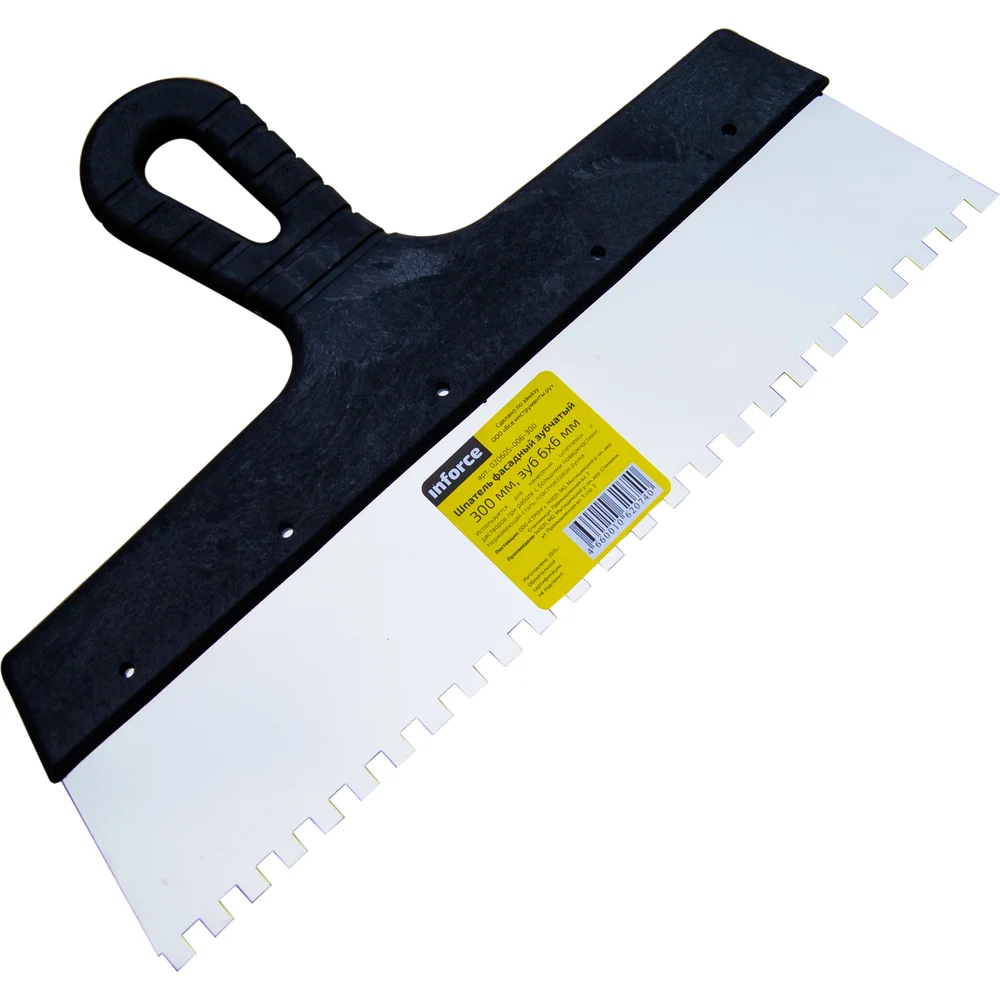 Зубчатый шпатель Inforce 300 мм зуб 6х6 мм с пластиковой ручкой 020605-006-300 является простым и прочным ручным инструментом, который предназначен для нанесение рабочего раствора при укладке плитки. Полотно с зубьями изготовлено из нержавеющей стали. Пластмассовая рукоятка отличается эргономичностью. Ширина полотна - 300 мм.