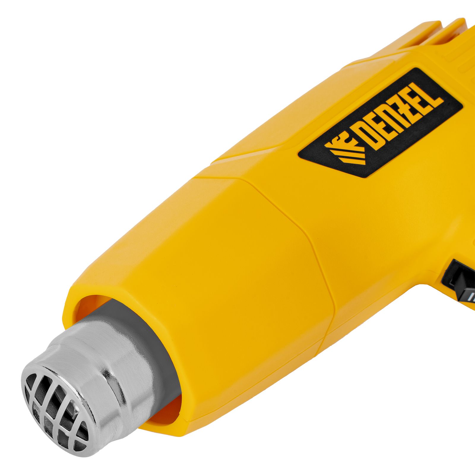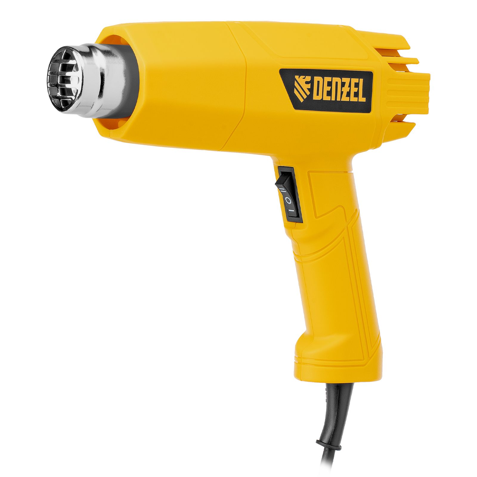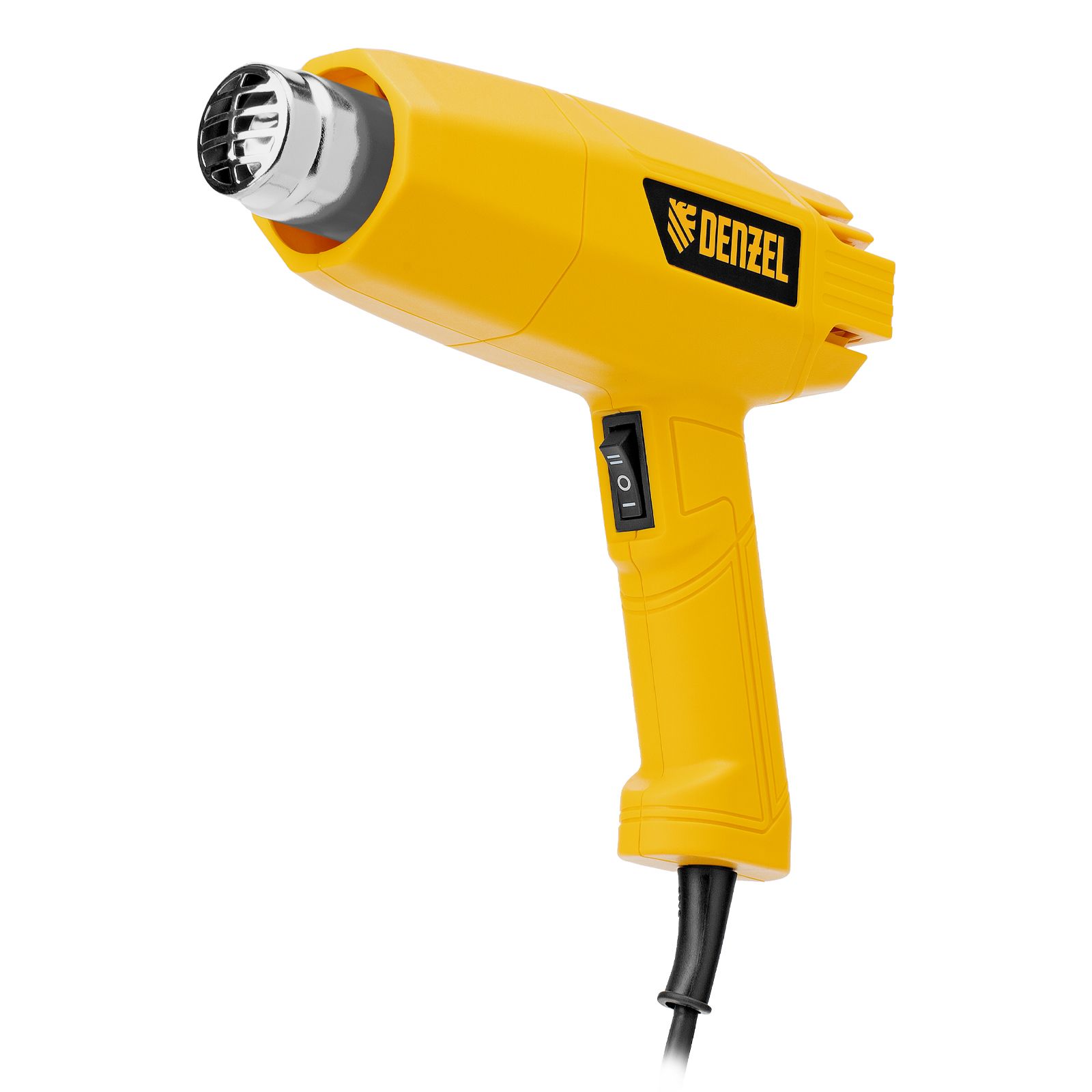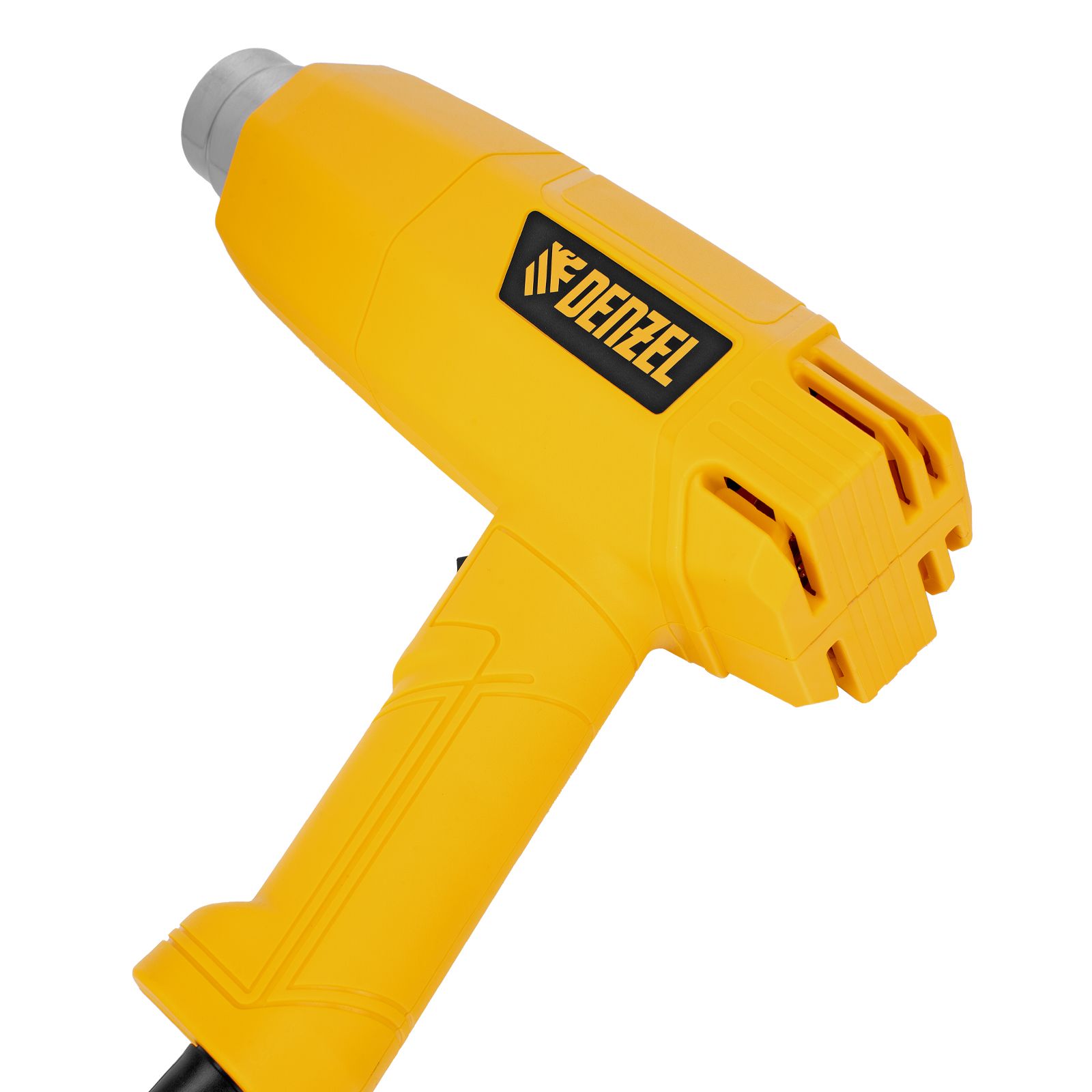 Технический фен Denzel HGP-2000 28004 мощностью 2000 Вт способен работать в двух режимах: подача воздуха объемом 300 л/мин при температуре 450 °C и генерация воздушного потока 500 л/мин при температуре 600 °C. Нужный режим легко устанавливается при помощи переключателя. Инструмент используется для просушивания поверхностей и соединений, сварки пластиковых труб, снятия обоев, линолеума и удаления лакокрасочных покрытий, размораживания труб, установки термоусадочных трубок, а также решения других задач.