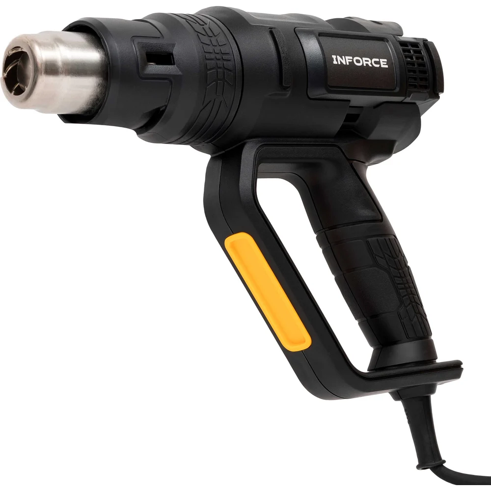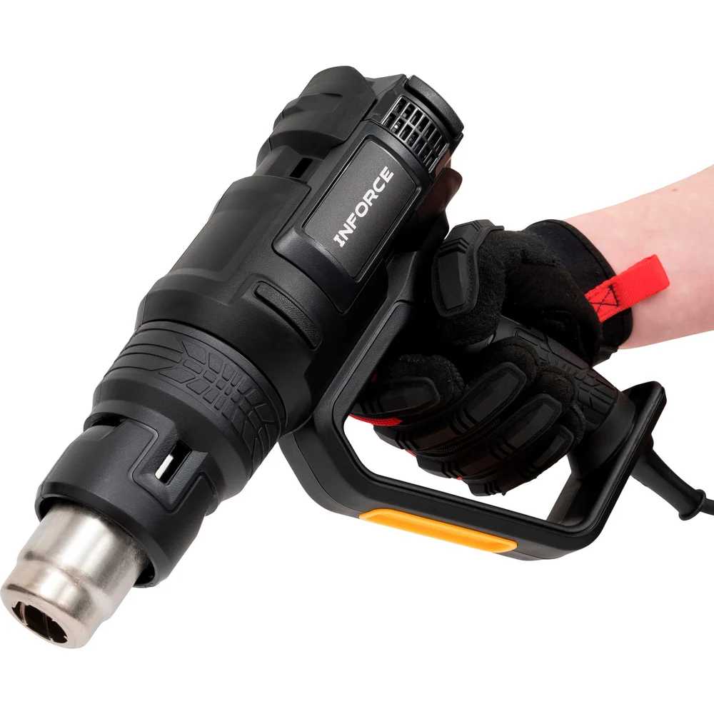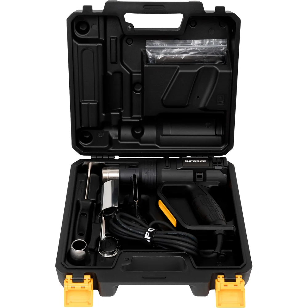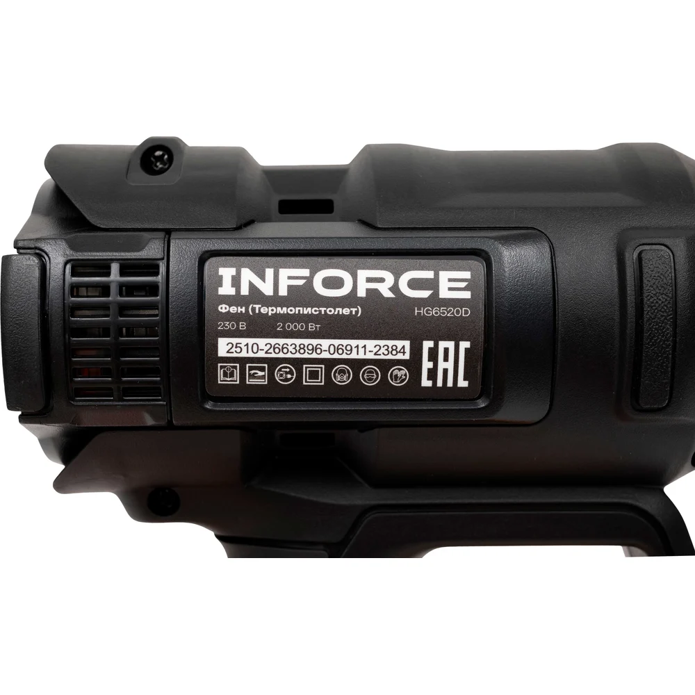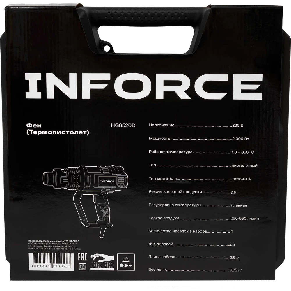 Фен (Термопистолет) Inforce HG6520D имеет 4 слота для сохранения режимов работы (Температура/скорость потока) во всем диапазоне температур и скоростей (50℃-650℃ / 250-500L/M). Улучшенная конструкция корпуса - рукоятка имеет защитный экран, защищающий пальцы пользователя от перегрева. Термопистолет с ЖК-дисплеем для плавной регулировки температуры и скорости воздушного потока. Имеется микроконтроллер с памятью для сохранения персонализированных настроек и быстрого переключения между предустановленными режимами. Поставляется в ударопрочном пластиковом кейсе для транспортировки и хранения насадок.