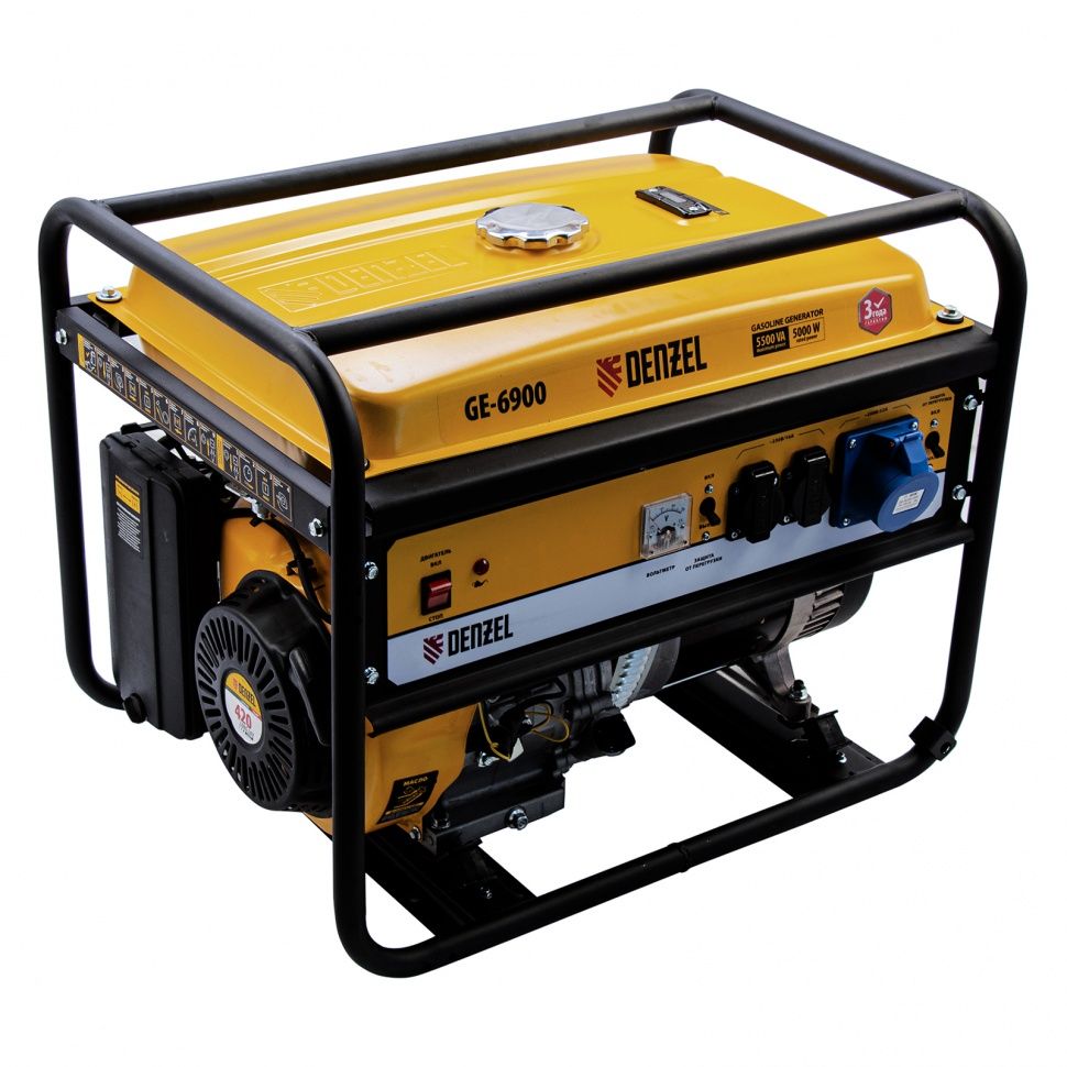 Мощный и экономичный генератор Denzel GE 6900 подходит для использования в загородном доме, торговой точке, на стройке или предприятии. Одновременно к нему можно подключить, например: 4 лампы накаливания, холодильник, телевизор и чайник. Силовая розетка позволяет снять полную мощность с генератора для подключения потребителей с высокими пусковыми токами. Экономичный двигатель позволяет эксплуатировать генератор в интенсивном режиме. Он потребляет 2,5 л/ч и может работать до 10 часов при полной нагрузке. Запустить генератор даже в холодную погоду не проблема - ручной стартер облегчает задачу. Гарантия 3 года. Преимущества:Двигатель DENZEL LONG LIFE: - Высокий ресурс и надежность: гильза выполнена из чугуна, распредвал и толкатели клапанов из стали, альтернатор с медной обмоткой, коленчатый вал из легированной стали, цилиндр и картер из алюминиевого сплава. - Автоматический декомпрессор облегчает запуск в ручном режиме и снижает нагрузку на стартер. - Балансировочный вал снижает уровень вибраций, что увеличивает ресурс подшипников коленвала. - Двигатель оснащен карбюратором YINBA/GUOI и свечой зажигания BOSCH - мировые признанные лидеры по качеству. Комплексная система защиты Multi Protect: - Индивидуальный предохранитель на каждой розетке обеспечивает защиту от короткого замыкания. - В случае скачков напряжения срабатывает система автоматического отключения. - Защита от запуска с низким уровнем масла продлевает срок службы генератора. - Блок AVR обеспечивает работу без скачков напряжения - можно не бояться за подключаемую технику. Надежность: - Усиленная рама состоит из труб увеличенного диаметра 32 мм с толщиной стенок 1,5 мм для защиты двигателя от повреждений. - Высокий контроль качества: сопрягаемые поверхности двигателя проходят инструментальный контроль. Удобство: - Индикатор топлива позволяет легко отслеживать уровень бензина, и вовремя наполнять бак. - Легко контролировать напряжение в системе благодаря вольтметру . - Можно перевозить даже в одиночку - крепления на раме позволяют установить ручки и колеса.