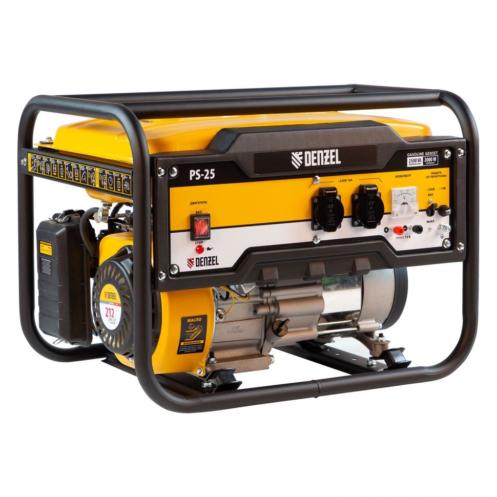 Доступный и простой в использовании генератор Denzel PS 25 с мощностью 2,5 кВт. Подойдет для дачи, в палаточном лагере, на рыбалке, в торговой точке. Он дает возможность подключать маломощные приборы и инструменты. Например можно подключить одновременно: 3 лампы накаливания, утюг, пылесос, холодильник. Весит всего 37 кг, поэтому его легко транспортировать. А благодаря его экономичности без дозаправки будет работать более 12 часов.Преимущества: - Интуитивно понятное управление - справится даже новичок. - Вольтметр и индикатор уровня топлива упрощают контроль за работой. - Мощный и экономичный двигатель с повышенным моторесурсом. - Безопасное использование - можно не бояться за подключаемую технику. Блок AVR обеспечит работу без скачков напряжения. - Защита от работы при низком уровне масла, от перегрузки и короткого замыкания обеспечит долгий срок службы. - Металлический распределительный вал, увеличенный диаметр провода обмотки статора и медная обмотка альтернатора значительно увеличивают срок службы генератора и качество его работы. - Производитель дает гарантию 3 года.
