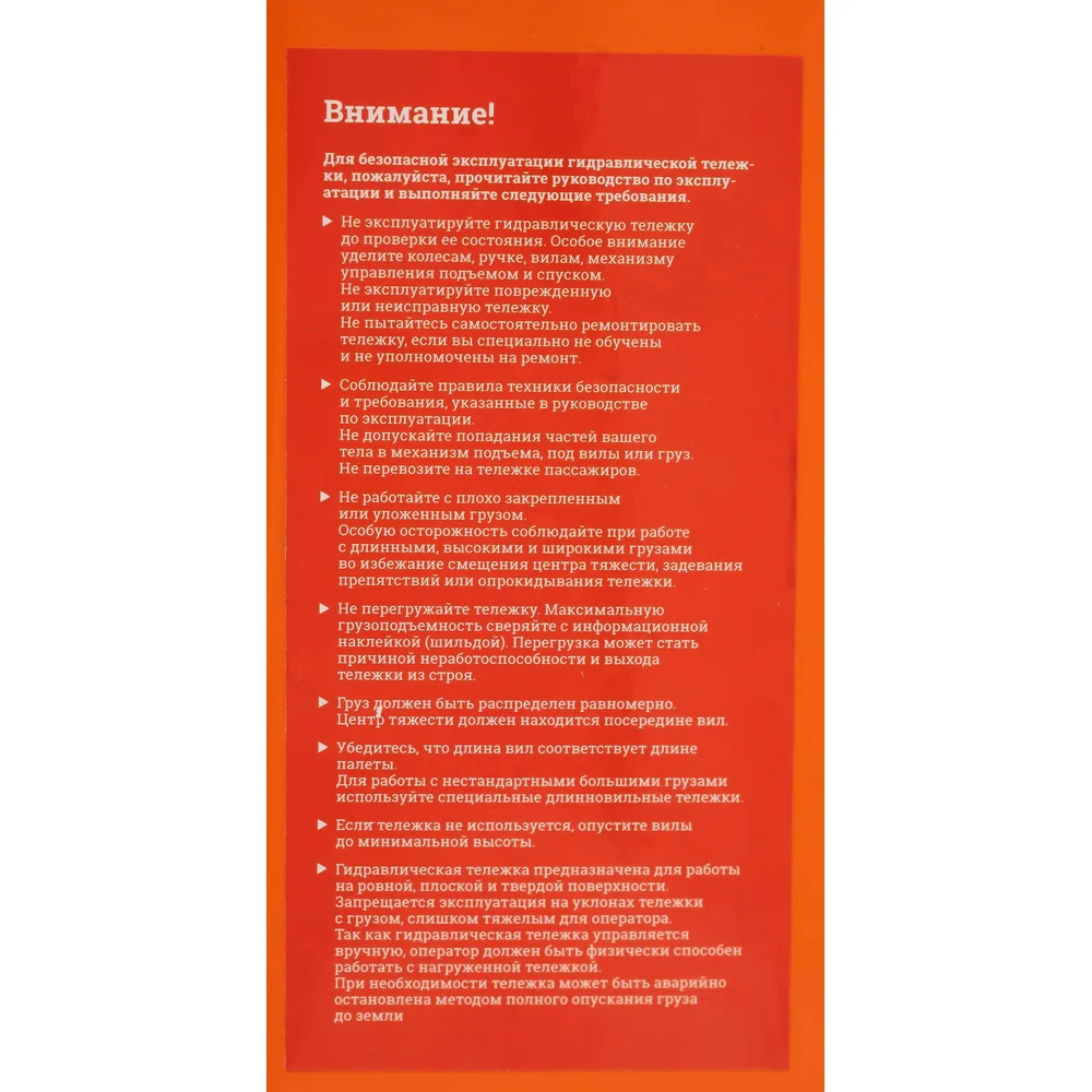 Гидравлическая тележка Gigant JHPT2500-800-PO подойдет для работы на складах со средней пропускной способностью. Наличие гидравлического узла позволяет перевозить палетированные грузы массой до 2,5 тонн. Минимальная высота подъема составляет 85 мм, максимальная - 195 мм. Длина вил - 80 см. Укороченные вилы хорошо подойдут для работы с небольшими паллетами. Компактные размеры обеспечивают отличную маневренность тележки как в узких проходах между стеллажами, так и в кузове автомобиля при его разгрузке. Благодаря оптимальной длине сохранена маневренность, необходимая для узких помещений. Полиуретановые колеса - для плавности. Gigant – собственная торговая марка компании ВсеИнструменты.ру, разработанная специально для требовательных мастеров. Продукция представлена профессиональными и бытовыми инструментами, имеет доступную цену и высокое качество. При изготовлении товаров Gigant используется современное оборудование и прочные материалы. Производство осуществляется на современных предприятиях России и Азии. Тестирование товаров осуществляется в два этапа, каждая партия инструментов проходит проверку на соответствие стандартам и заявленным техническим характеристикам. Это является залогом качества и надежности готового продукта. Продукция представлена широкой линейкой инструментов. У нас можно приобрести ручной инструмент, строительный, садовый, сантехнический, климатический, крепежный, автогаражный, а также станки, расходные материалы и многое другое.