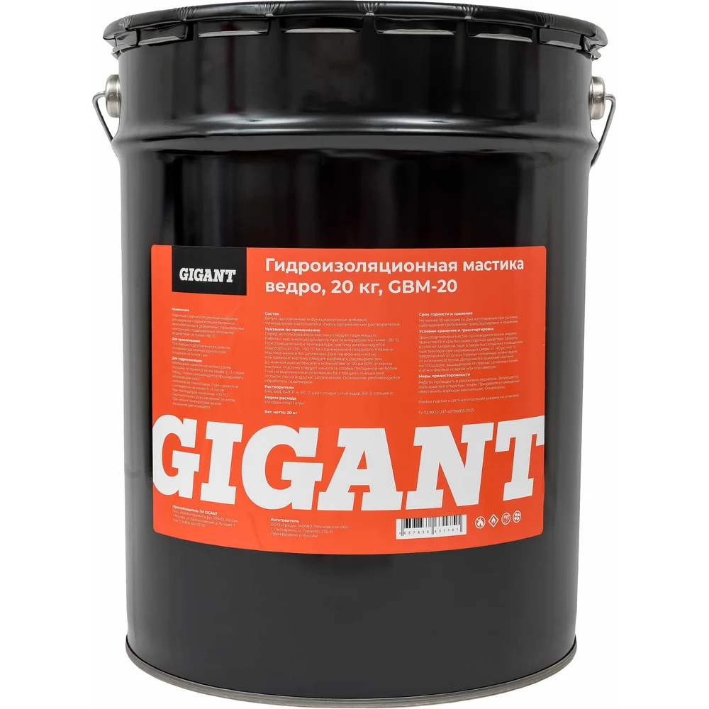 Гидроизоляционная мастика Gigant ведро 20 кг GBM-20 служит отличным решением для обмазочной гидроизоляции бетонных, стальных и деревянных строительных конструкций, расположенных ниже и выше уровня земли и имеющих прямой контакт с грунтом и влажной средой (различные виды фундамента, сваи, полы и стены подвалов и бойлерных).