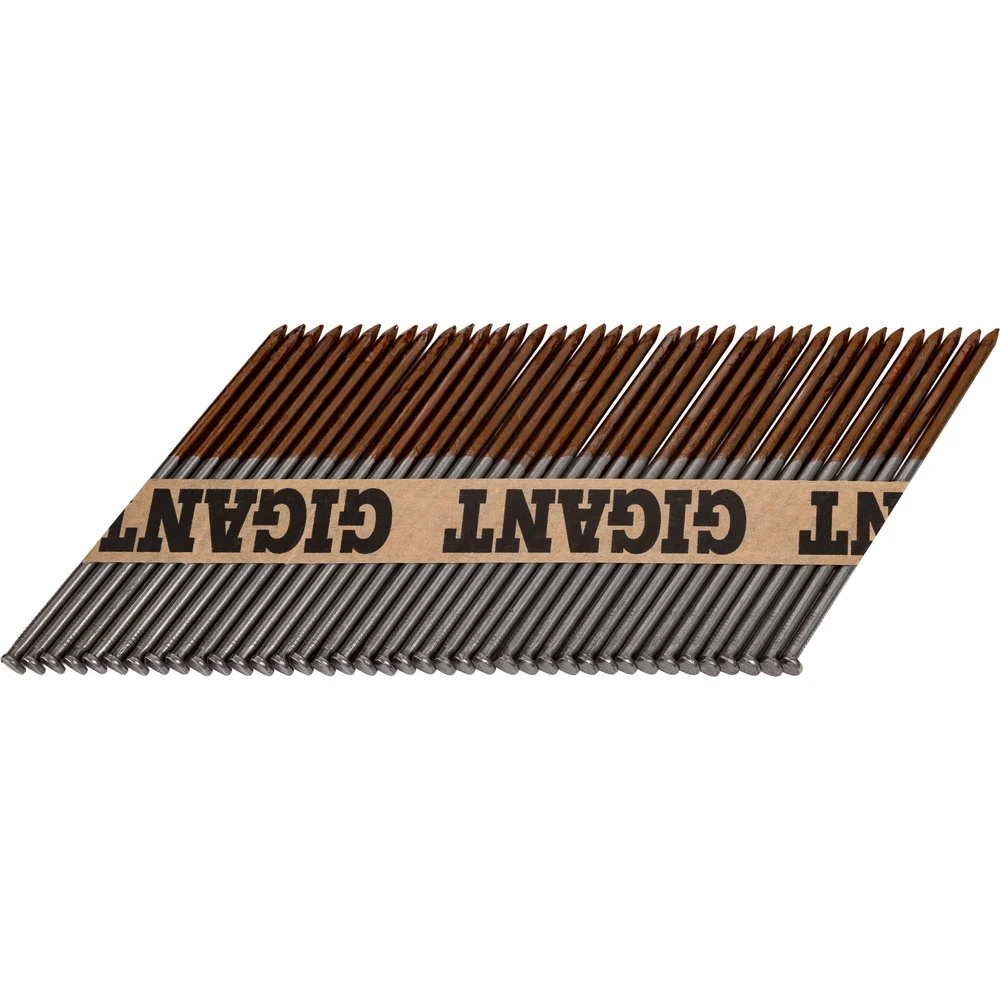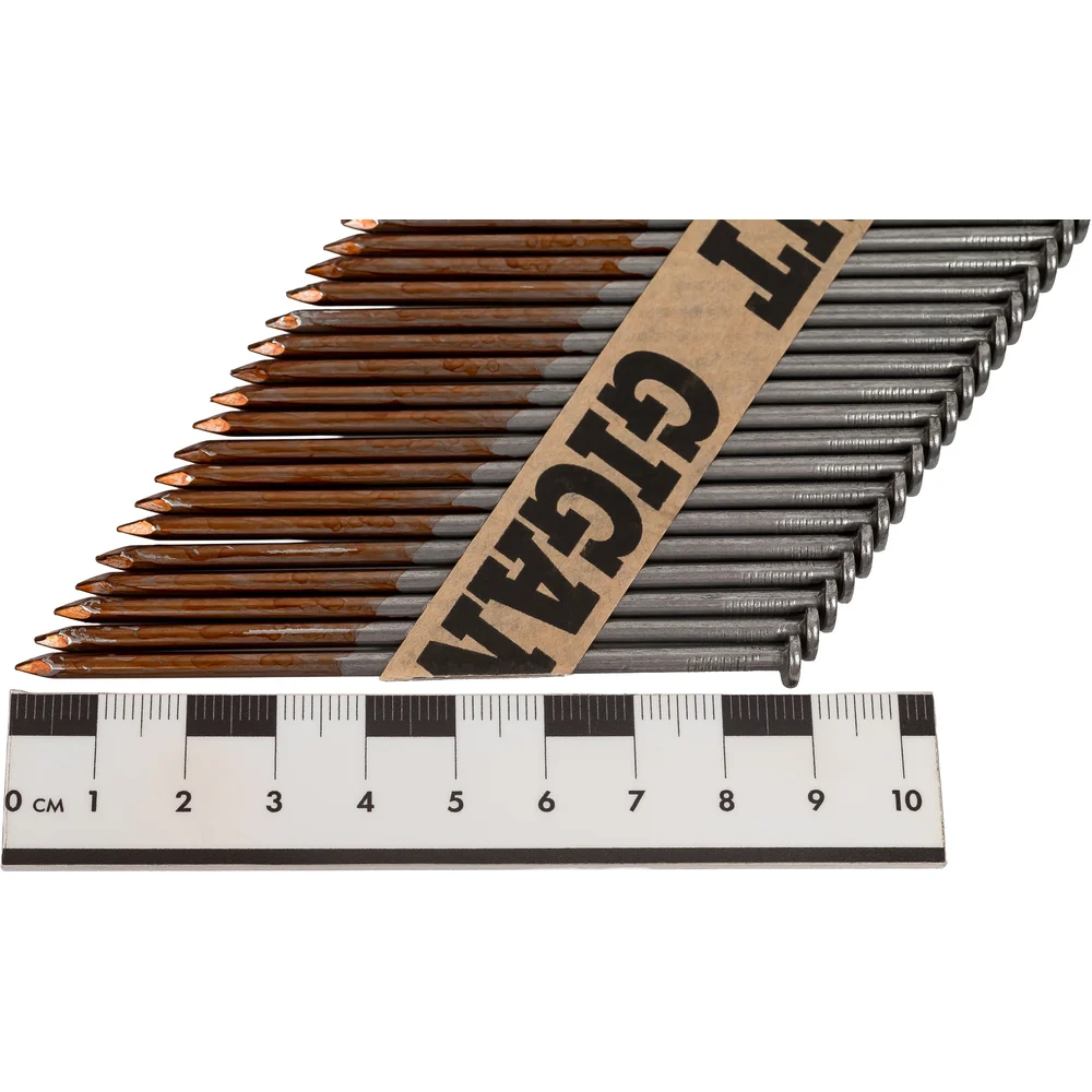 Реечный гвоздь по дереву Gigant GGR-90-3SZ используется в строительстве (сборке стропильных систем, деревянных каркасов), упаковочных работах и иных сферах. Упаковка из 2000 штук делает их экономичным выбором для крупных проектов. Расположены под углом 34 градуса, это позволяет не задевать шляпку соседнего гвоздя при монтаже и увеличивает срок службы пистолета. В комплекте 50 кассет на бумаге, в каждой кассете по 40 гвоздей. Могут использоваться с газовыми или аккумуляторными пистолетами большинства производителей, представленных на рынке (Hybest, Fubag, Зубр, Metabo и др.). Бумажная основа и клей подобраны таким образом, что кассеты не разбиваются при падении, а при монтаже бумага полностью отделяется с гвоздем и не застревает в обойме.