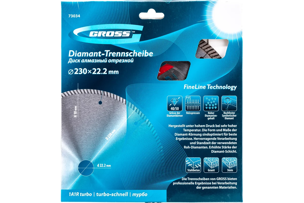 Алмазный диск Gross диаметром 230 х 22,2 мм (модель 73034) предназначен для сухой резки различных твердых материалов, таких как бетон, железобетон, кирпич, гранит, камень и песчаник. Технология лазерной перфорации, применяемая в конструкции, обеспечивает эффективное охлаждение диска, что делает его особенно подходящим для длительной и интенсивной эксплуатации на профессиональных углошлифовальных машинах (УШМ).