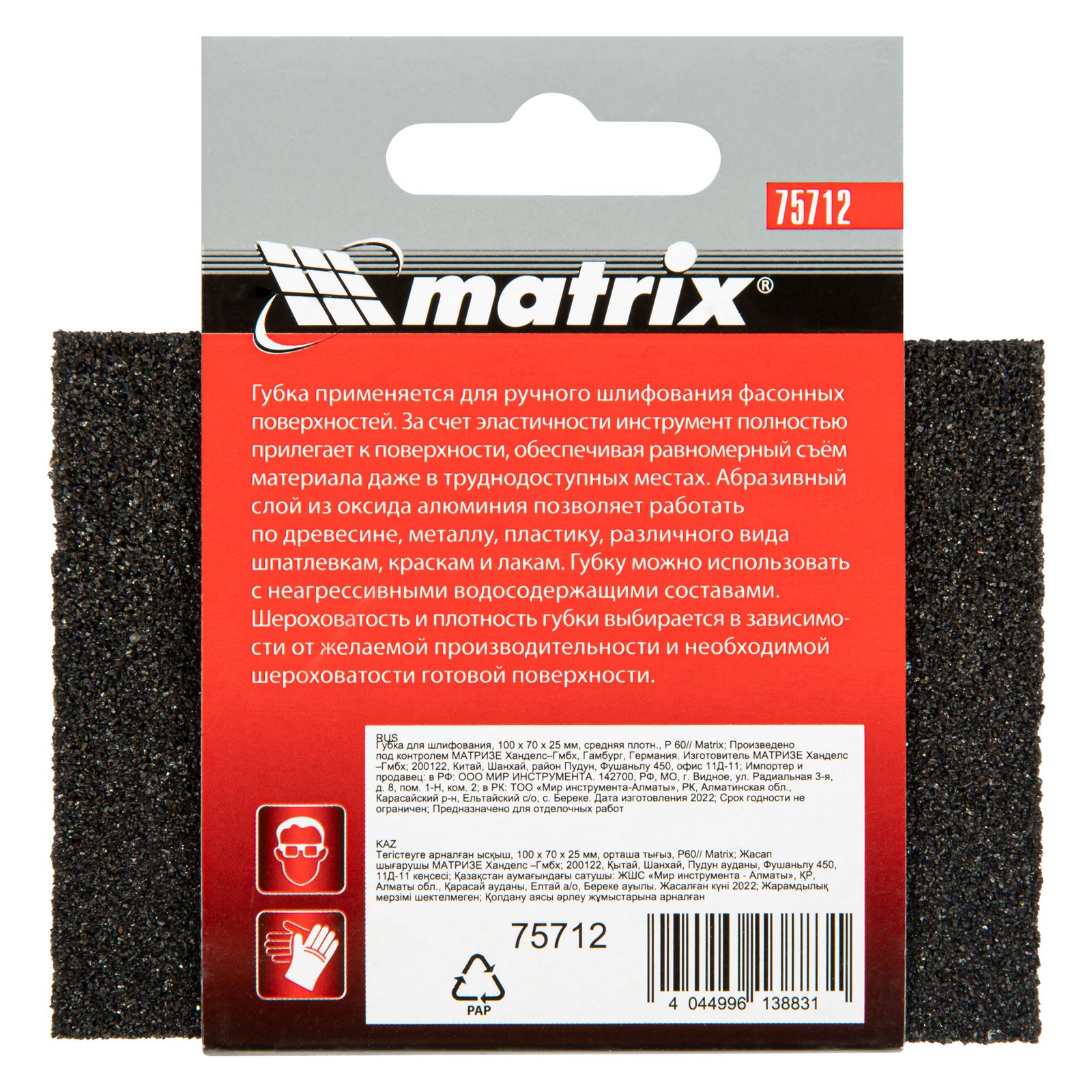 Губка для шлифования средней плотности Matrix 75712 размером 100 х 70 х 25 мм, с зернистостью P 60, используется для черновой шлифовки деревянных, пластиковых, металлических, шпаклеванных поверхностей, удаления слоя краски и ржавчины. Абразивная губка пригодится для проведения строительных, ремонтных, кузовных работ, будет полезна в изготовлении мебели и в быту.