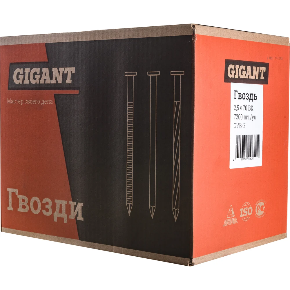 Gigant Гвоздь 2,5x70 BK 7200 шт./уп GVB-2 - расходный материал для различных работ. Будут полезны в ходе строительных, ремонтных и облицовочных работ, пригодятся также при производстве мебели. Угол наклона составляет 15%. Длина гвоздей - 70 мм, диаметр шляпки - 6,5 мм, сечение/диаметр - 2,5 мм. В упаковке - 7200 штук. Гвозди обеспечивают надежное соединение материалов из древесины, ДСП, оргалита, металла. Применяются для строительства и ремонта, производства поддонов, кабельных барабанов и деревянной тары. Изготовлены из стали с цинковым покрытием - защита от коррозии. Gigant – собственная торговая марка компании ВсеИнструменты.ру, разработанная специально для требовательных мастеров. Продукция представлена профессиональными и бытовыми инструментами, имеет доступную цену и высокое качество. При изготовлении товаров Gigant используется современное оборудование и прочные материалы. Производство осуществляется на современных предприятиях России и Азии. Тестирование товаров осуществляется в два этапа, каждая партия инструментов проходит проверку на соответствие стандартам и заявленным техническим характеристикам. Это является залогом качества и надежности готового продукта. Продукция представлена широкой линейкой инструментов. У нас можно приобрести ручной инструмент, строительный, садовый, сантехнический, климатический, крепежный, автогаражный, а также станки, расходные материалы и многое другое.