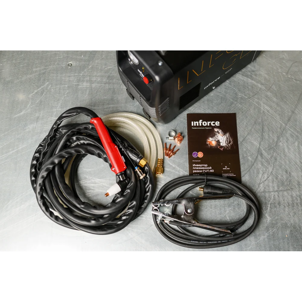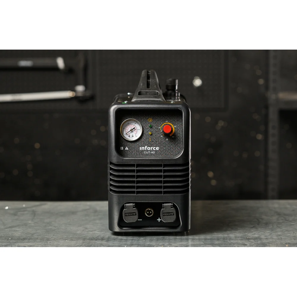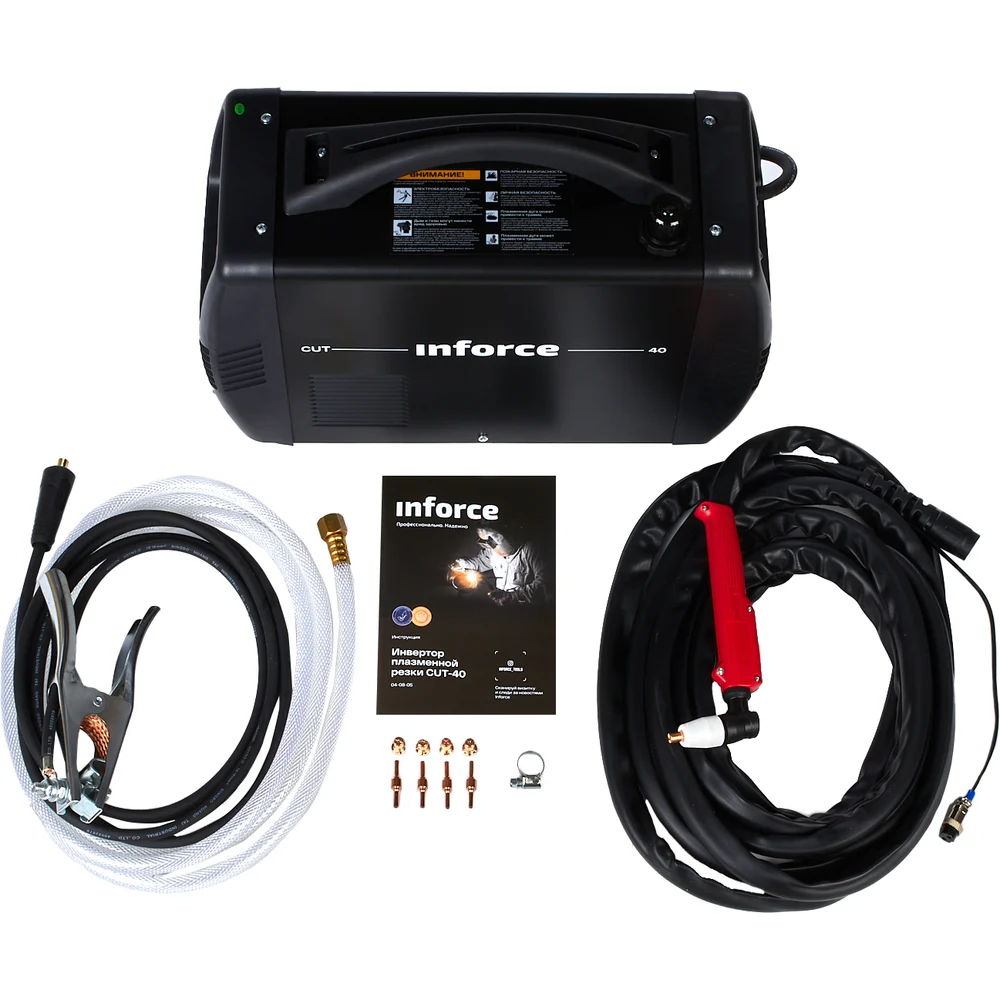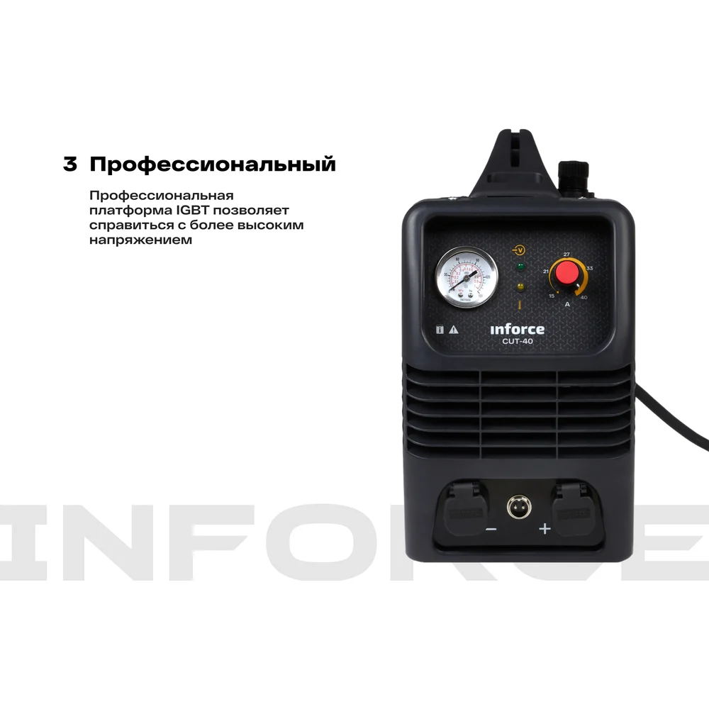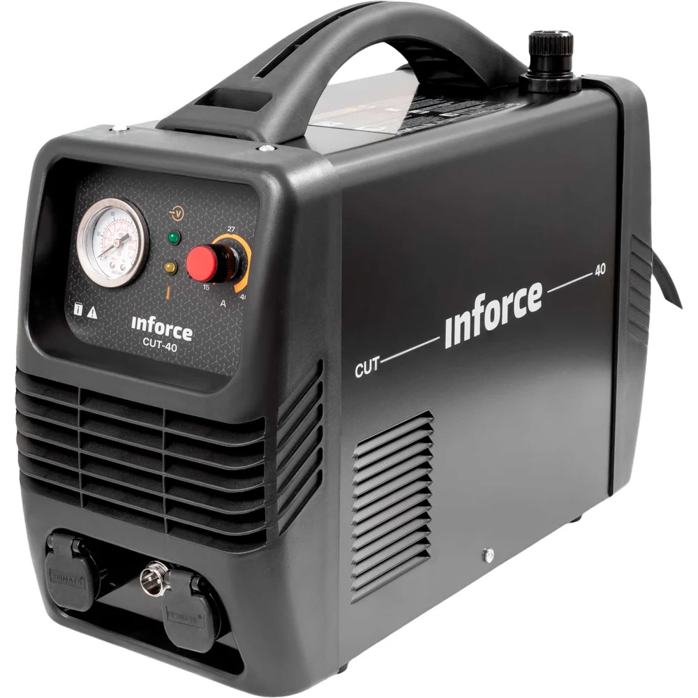 Инвертор плазменной резки Inforce CUT-40 04-08-05 предназначен для профессионального использования. Современная платформа IGBT позволяет справиться с более высоким напряжением при работе с помощью наличия дополнительного края. Возможность настройки времени продувки плазмотрона после окончания резки, что позволяет защитить горелку от преждевременного износа и сэкономить на расходные материалы. Подходит для работы с любым токопроводящим материалом (любые типы стали и меди и ее сплавы алюминия). Толщина разделительного реза стали до 15 мм. Для работы аппарату необходим компрессор потреблением воздуха 170 л/мин при давлении 4-5 бар. Катоды плазмотрона имеют два рабочих положения. Если катод изношен с одной стороны, его можно перевернуть и продолжить резку. На фронтальной панели аппарата расположены ручки настройки тока реза и времени продувки по окончании сеанса, индикаторы сети перегрева и неисправности. В нижней части аппарата находится гнездо подключения плазмотрона и розетка обратного кабеля, между ними коннектор управления плазмотрона.