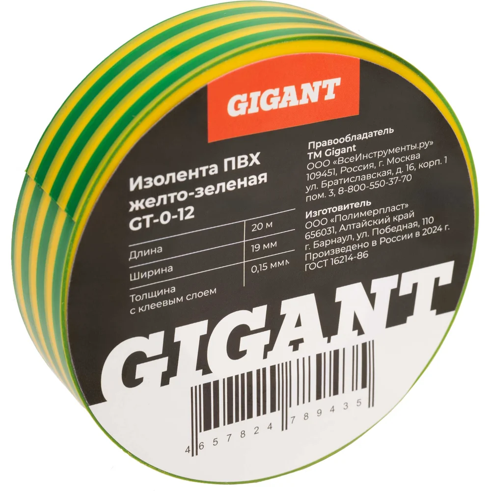 Изолента Gigant ПВХ 19x20м желто-зеленая GT-0-12 - это расходный материал, который подойдет для проведения электромонтажных работ. Служит для электроизоляции кабелей или проводов. Изделие представляет собой резиновую основу с ПВХ-пленкой, которая обладает клеевым слоем. Цвет - желто-зеленый. Размер - 19ммх20м.