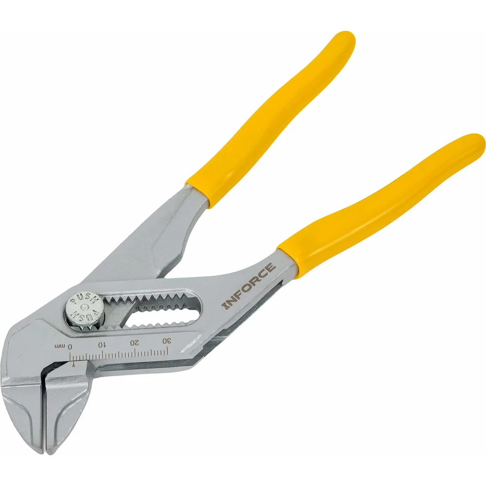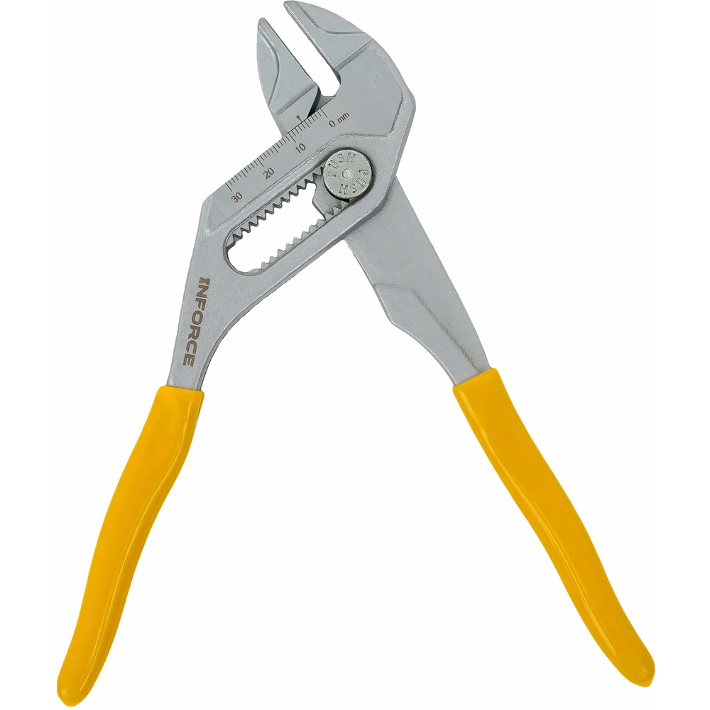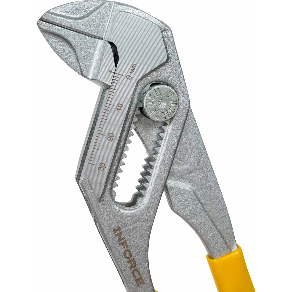Клещи переставные-гаечный ключ Inforce 06-18-66 предназначены для выполнения слесарно-монтажных и ремонтных работ. Плавная настройка раствора, до 35 мм. Не повреждает крепёж, в том числе и хромированный. Быстрая настройка нажатием кнопки. Закалка до 50HRC. Ход захватных губок обеспечивает быстрое затягивание и ослабление винтовых крепежей по принципу трещотки. Уникальная конструкция исключает случайную перестановку и проскальзывание шарнира. Подходит для сгибания и сдавливания обрабатываемых деталей. 17 положений регулировки для более удобного захвата. Высокая сила зажима благодаря 10-кратному увеличению усилия на рукоятке.