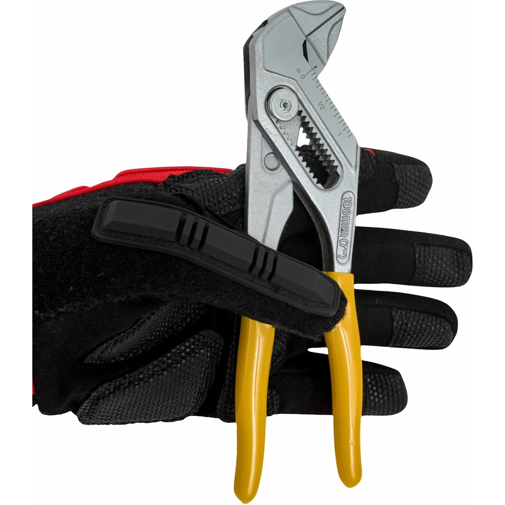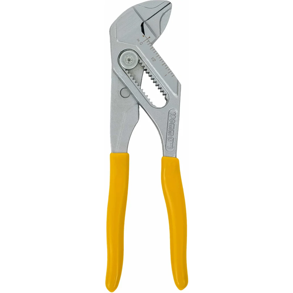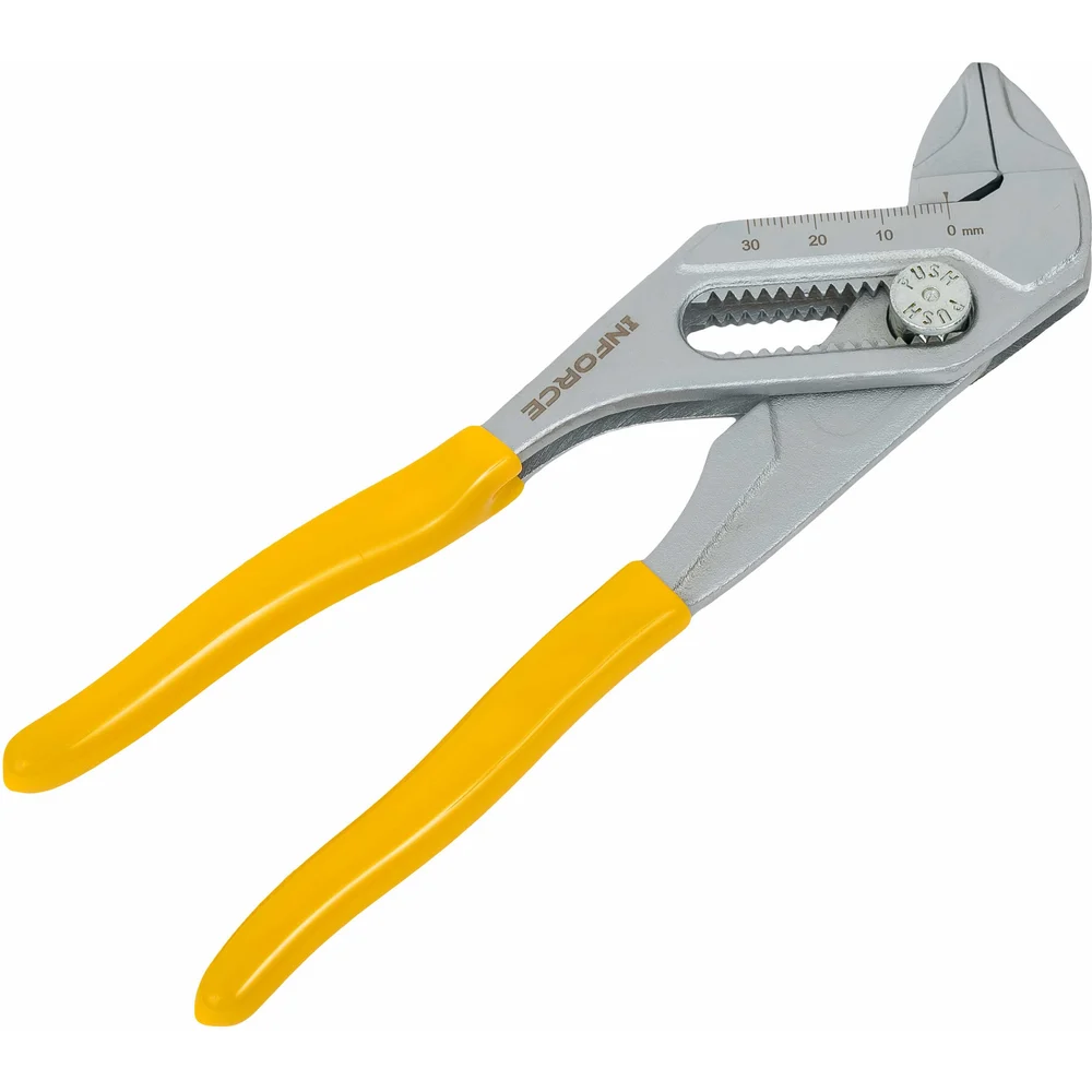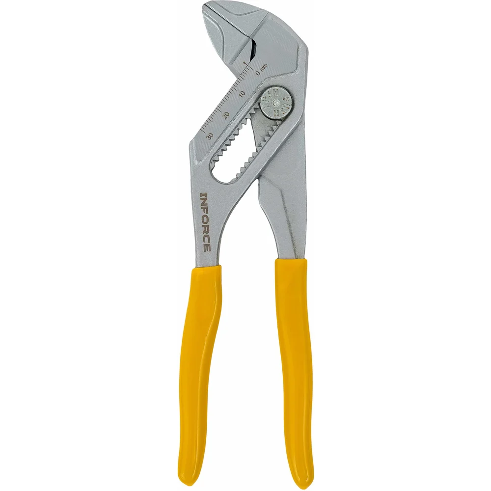 Клещи переставные-гаечный ключ Inforce 06-18-66 предназначены для выполнения слесарно-монтажных и ремонтных работ. Плавная настройка раствора, до 35 мм. Не повреждает крепёж, в том числе и хромированный. Быстрая настройка нажатием кнопки. Закалка до 50HRC. Ход захватных губок обеспечивает быстрое затягивание и ослабление винтовых крепежей по принципу трещотки. Уникальная конструкция исключает случайную перестановку и проскальзывание шарнира. Подходит для сгибания и сдавливания обрабатываемых деталей. 17 положений регулировки для более удобного захвата. Высокая сила зажима благодаря 10-кратному увеличению усилия на рукоятке.