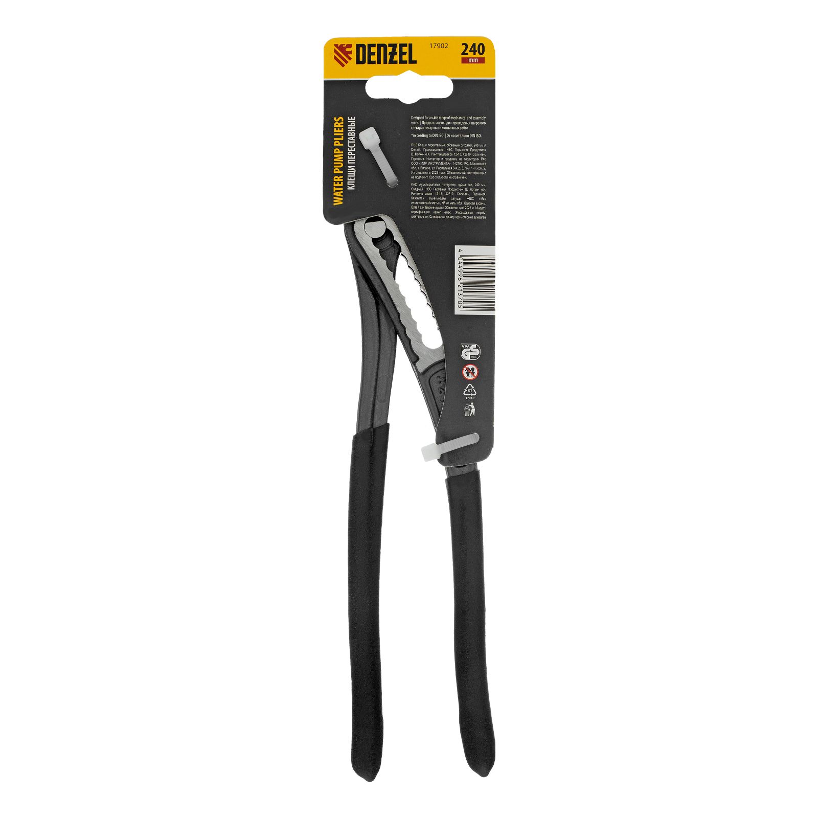 Переставные клещи Denzel 17902 длиной 240 мм, с обливными рукоятками, предназначены для фиксации и вращения деталей и заготовок различной формы. Подходят для захвата фитингов, труб, крепежных элементов. Инструмент используется при проведении ремонтных, монтажных, сантехнических работ.