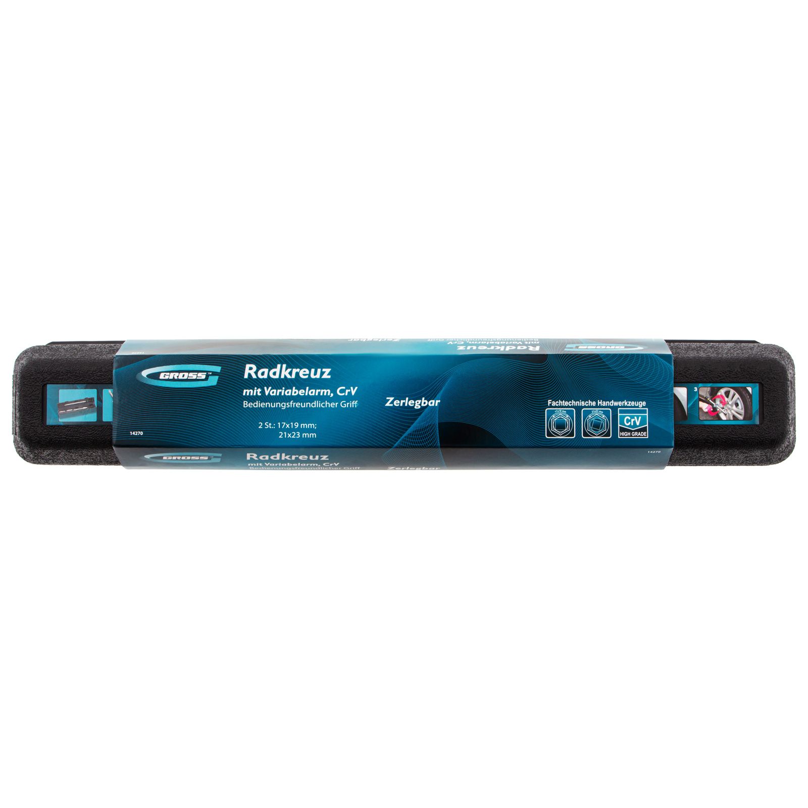 Складной баллонный ключ-крест с изменяющимся рычагом Gross 14270 из стали CrV, хромированный, с головками на 17, 19, 21, 23 мм, предназначен для откручивания и закручивания колесных крепежей. Поставляется с двумя двусторонними торцевыми головками под 4 размера резьбовых соединений. Запатентованный механизм фиксации телескопической рукоятки позволяет изменять длину рычага и оптимально дозировать величину крутящего момента. Инструмент рекомендован для профессионального использования, также может применяться для самостоятельного обслуживания автомобиля.