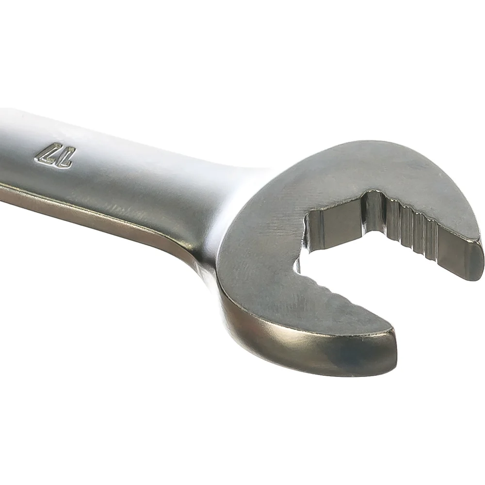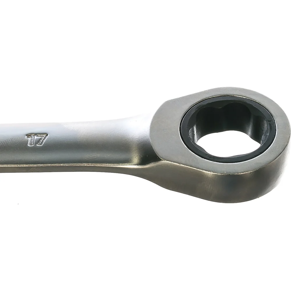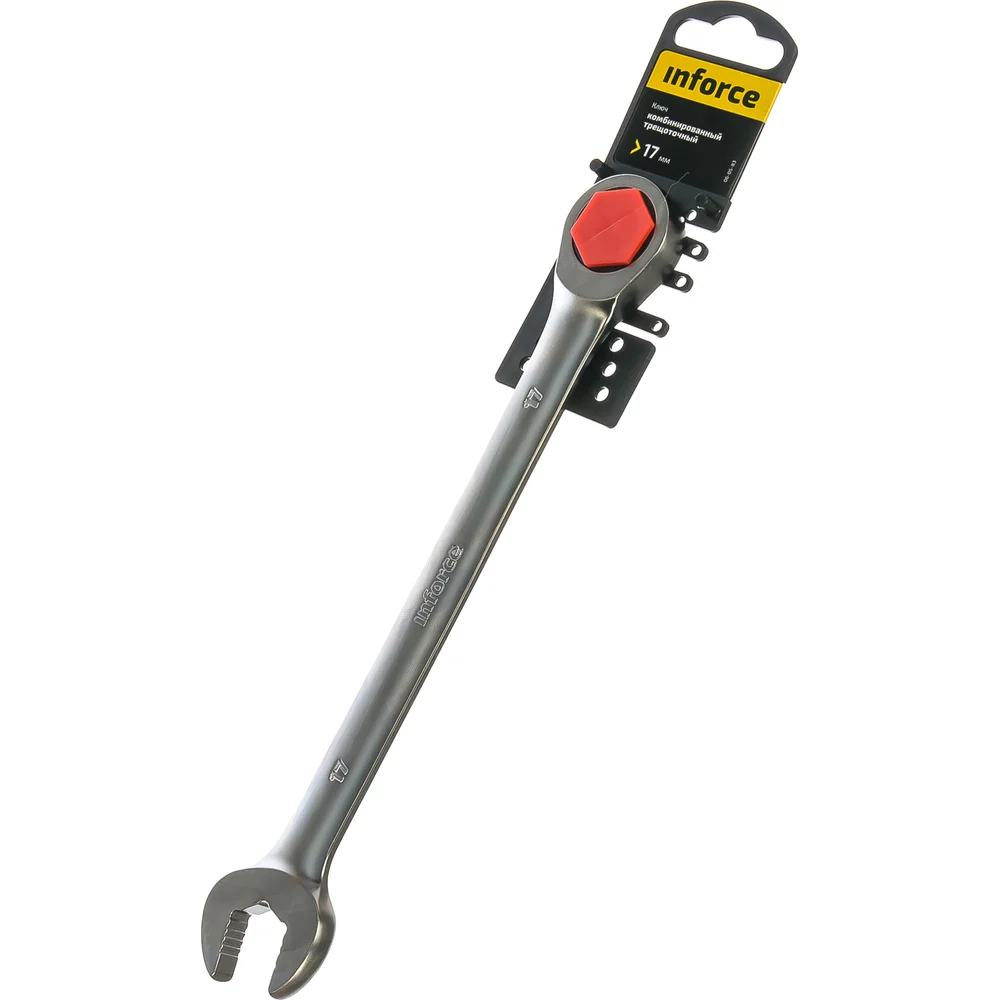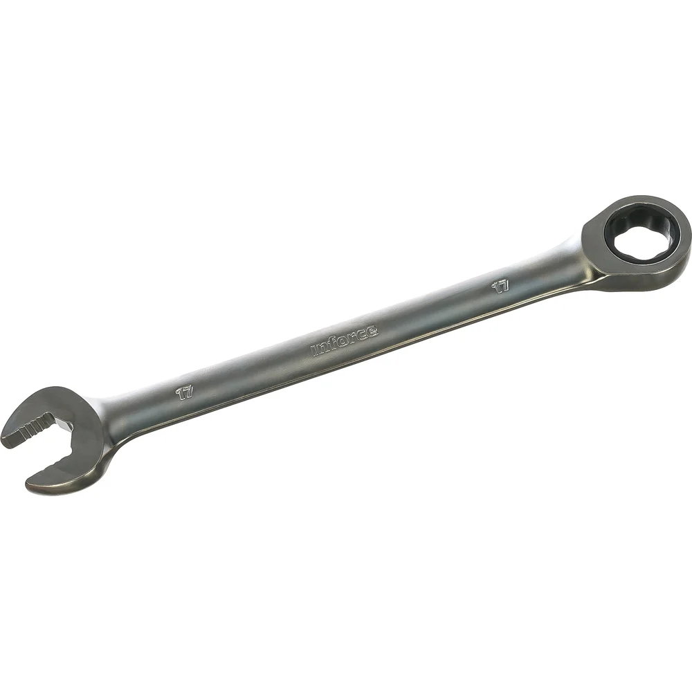 Комбинированный трещоточный ключ 17мм Inforce 06-05-83 выполнен из прочной хромованадиевой стали. Сплав выдерживает значительное давление и воздействие коррозии. Одна головка выполнена с трещоткой, другая приспособлена для безопасного затягивания крепежа.