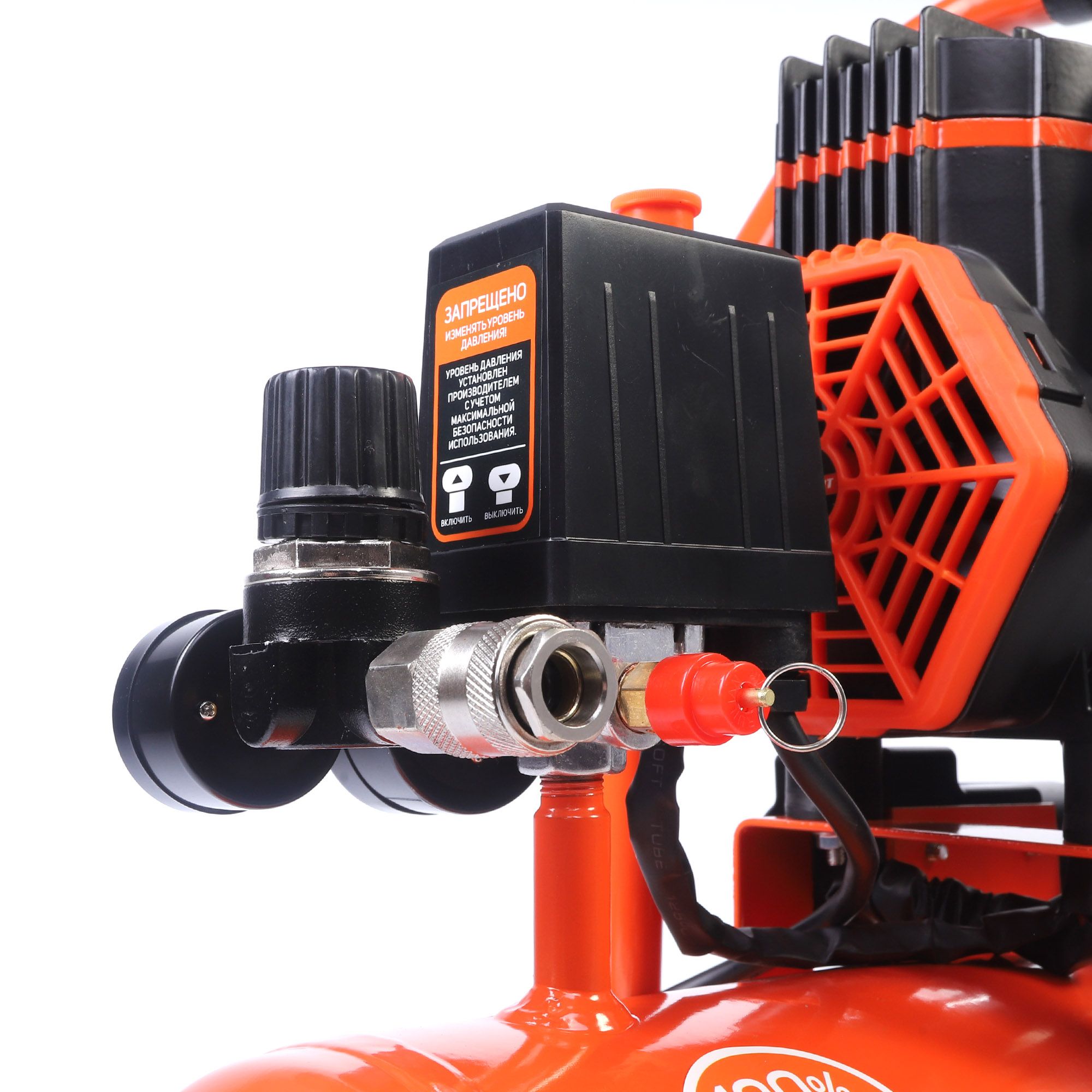Компрессор с рабочим давлением 8 бар очень тихий для своей категории, всего 70 дБА. Двухполюсной высокооборотистый двигатель с термозащитой обладает высокой производительностью. Двухцилиндровый компрессор способен справляться с интенсивными задачами. Увеличенные ребра охлаждения способствуют эффективному отводу тепла во время длительной непрерывной работы. В компрессоре предусмотрены функции защиты от перегрева, превышения тока, а также есть предохранительный и электромагнитный клапаны. Два выхода: быстросъемный типа «RAPID» с запирающим ниппелем и «елочка» с шаровым краном. Два манометра основной на давление в ресивере и дополнительный с редуктором для предустановки нужного давления. Удобная рукоятка и прорезиненные колеса для удобства для транспортировки.