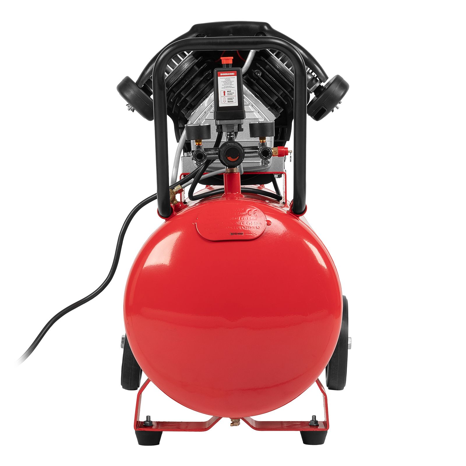 - Мобильность — благодаря колесам и рукоятке компрессор удобно разворачивать и перемещать по рабочей площадке.